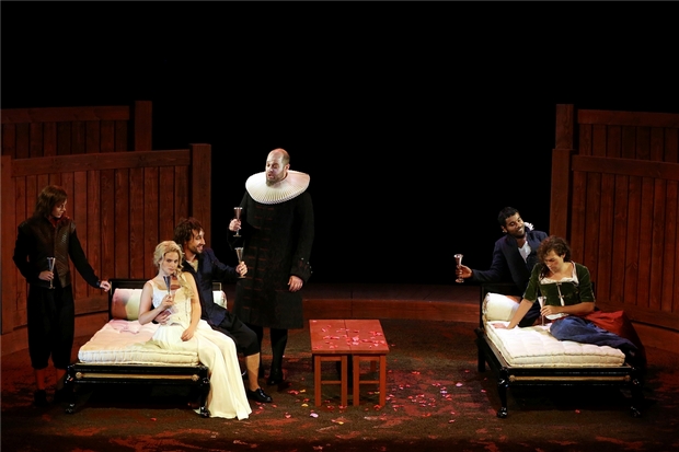 Elena à Aix © Patrick Berger/ArtComArt Il n'est pas facile de rendre compte de cette pièce aux incessants rebondissements, aux multiples intrigues menées par des personnages nombreux, dont plusieurs sont déguisés. On pourrait toutefois la résumer dans ce constat : Ricardo Garcia Alarcon, ses musiciens et ses chanteurs excellent à recréer l'atmosphère de merveilleux burlesque, de truculence antique qui surgit à chaque instant du livret. Côté orchestre, la ligne musicale inspire de près l'action théâtrale : l'atmosphère de farce comique transpire dès l'ouverture, les sonorités des instruments baroques sont irréprochables, les trompettes sonnent avec vigueur dans le chœur qui accompagne l'arrivée des Argonautes, et le quatuor final est enlevé avec vigueur. Du côté des chanteurs, la palme revient sans conteste à Kangmin Justin Kim, incroyable Ménélas dont la voix de contre-ténor se pare d'un timbre parfaitement féminin de sopraniste, laissant le public bouche-bée lorsqu'il dévoile son torse dépourvu de poitrine ! Parmi ses principales performances vocales, citons son air d'entrée ("So che ride Amor/ Peno, languisco e moro"), celui où il renonce à poursuivre son travestissement afin de séduire une Hélène qui est en train de lui échapper ("Hor va misero core/ Cieco Dio", qui clôt la première partie avant l'entr'acte), et l'irrésistible duo avec Pirithoüs "Del piccolo amore" (à la scène VI du second acte). Autre contre-ténor de la distribution incarnant des rôles travestis, Christopher Lewrey incarne avec jubilation La Discorde au prologue. Dans le rôle d'Eurypyle, son duo philosophico-comique sur l'amour avec Diomède (Brendan Tuohy) est très réussi. Toujours dans le registre de contre-ténor, le brésilien Rodrigo Ferreira s'acquite avec brio du rôle comique de Pirithoüs, jusqu'à la confusion finale qui révèle la véritable identité d'Elisa-Ménélas. Emöke Baràth est à son aise dans les habits d'une Hélène frivole, prête à se jeter dans les bras du premier venu. Sa rêverie "Delizie d'amore" est pleine de volupté érotique, et son enjouement à recevoir les aveux de Ménélas après lui avoir déclaré son inclination pour Thésée est parfaitement simulé lorsqu'elle s'en remet à Amour ("Tu disponi del mio cor"). Ajoutons-y son incarnation d'une Vénus imbue de sa beauté au prologue. L'Hyppolité de Kirry Whately exprime avec talent son désespoir de fière Amazone lorsqu'elle apprend les frasques de son amant (le long récitatif cantando "Chi l'avanzo odioso"), bouleversée lorqu'elle hésite à le frapper ("Ahime, che veggio ?"). Face à ces deux amantes, Fernando Guimaràes campe un Thésée au physique avantageux, et à la voix non moins séduisante, notamment dans les ensembles (duo du second acte avec Hélène, ou trio burlesque avec celle-ci et Ménélas-Elisa mentionné plus haut). Dans le rôle du père putatif soucieux de sa progéniture, Krzysztof Baczyk donne de sa voix de basse bien posée à l'ample projection. Il alterne habilement entre le registre comique (lors de son "coup de foudre" pour "Elisa" : "Soi che ride Amor di me") et le désespoir noble du géniteur dont la fille a été enlevée ("Se non torna il bel ch'adoro"). Sa brève incarnation de Neptune au début du premier acte est emplie d'une majestueuse prestance.