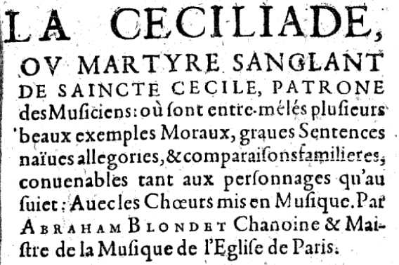 Détail de la page de titre de l'édition du livret (Chez P. Rezé, paris, 1606). On notera la mention des chœurs mis en musique. © Gallica / BNF Le premier chœur est hélas brouillé par l'acoustique extrêmement réverbérante du lieu qui rend les contours très imprécis et la compréhension du texte difficile, malgré une écriture droite et homophonique. Philippe Foulon et Jean-Charles Léon ont choisi de distribuer l'écriture à quatre parties de l'œuvre en passant par moment les deux voix supérieures au chœur et les autres réalisées par le Lachrimae Consort. Les vers de Blondet sont ensuite tous déclamés par Philippe Chemin, mais souffrent d'un double défaut : celui d'un investissement dramatique bien peu inspiré (sauf au dernier acte) - l'acteur se contentant de réciter avec plus ou moins de bonheur les alexandrins de manière monotone - et celui du manque d'interaction, puisqu'il détient en main tous les personnages et doit donc citer avant chaque tirade le nom du protagoniste. N'aurait-il pas été plus judicieux de distribuer chacun des rôles en lui associant des musiciens ou membres du chœur ? Quoiqu'il en soit, on sourit devant la variété des styles de Soret, qui oscille entre la maladresse naïve et la verdeur violente. Le livret a subi de nombreuses coupes pour des raisons compéhensibles de durée mais l'intégralité en est consultable en ligne et s'avère finalement d'un niveau littéraire plus élevé que la juxtaposition des passages entrevus. L'on passe ainsi des mignardises de "Cécile, hôtesse de mon cœur" à la foi populaire de "Dieu que vous êtes beau, que vous êtes luisant", pour finir sur la brutalité franche de "Me voilà ià tout prêt, il ne faut que trois mots / Tue, tue, bourreau, massacre ces cagots". A l'inverse, les passages musicaux, quoique fort brefs, dénotent une élégance simple, influencée par l'air de cour, avec des formes closes strophiques. Celles-ci ont été habilement distribuées entre airs pour solistes, duos, reprises par le chœur. Le timbre clair, transparent au vibrato impeccablement contrôlé d'Edwige Parat (dont la prestation n'a pas souffert de son rhume automnal) convient à merveille à la future Sainte. Les aigus sont purs, les articulations soignées et respectant la prosodie. Le "Cantique de Sainte Cécile dedans une chaudière (sic)" fut interprété avec grâce et humilité, dénotant une ferveur épurée. Les mêmes compliments vont à son confrère Emmanuel Vitorsky, qui ferait une parfaite taille de grand motet versaillais, de sa voix ronde et profonde, chaleureuse, un rien grainée, bien égale sur l'ensemble de la tessiture. Les chanteurs sont accompagnés avec souplesse et complicité par un Lachrimae Consort dont on ne peut que louer l'extraordinaire richesse harmonique, lorsque le plaisir des yeux s'allie à celui des oreilles. Les cordes opulentes, dotée de cette poésie mélancolique des violes (superbes viole d'amour et lira da gamba de Philippe Foulon et Jean-Charles-Léon respectivement), n'ont pas peu contribué au succès de la représentation, de même que le luth de William Waters - étrangement avantagé par l'acoustique - dont les perles scandaient de manière rêveuse le drame soudain adouci. Ce tapis discret et moiré, quelquefois relevé par le cornet à bouquin ou cornet muet de Benjamin Bedoin, rappelle soudain à l'auditeur qu'il se trouve à une période charnière de la musique française, encore empreinte des legs de la Renaissance et qui perdurera jusqu'au milieu du Grand Siècle. Enfin, le concert-récitation se conclut sur une "Exhortation aux aspirants musiciens" à l'écriture légèrement plus contrapuntique du fait d'entrées fuguées. La redécouverte de cette Céciliade a constitué un temps fort du colloque "Théâtre, Art et Violence" organisé par l'Université Paris Ouest Nanterre La Défense, et de l'interdisciplinarité a ressuscité une œuvre unique, d'un intérêt musical et musicologique certain. Aussi, en dépit de certaines réserves (récitant unique, acoustique défavorable au chœur), nul ne regrettera, à l'instar de la sainte, d'être tombé "dedans le chaudron".