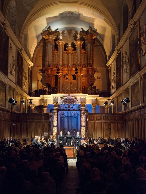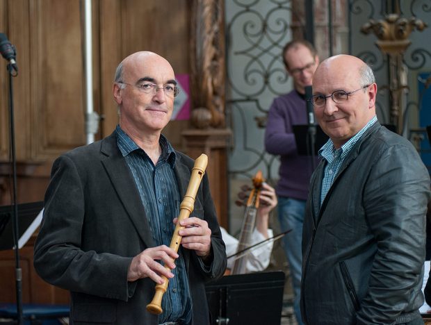 Jean-Marc Andrieu et Michel Bouvard © JJ Ader, 2013 Construite dès 1602 l’église a été décorée par les artistes toulousains célèbres de l’époque qui participèrent à la construction du Capitole, du Pont neuf, etc…. Sous une haute coupole finement ornementée, le monumental maître autel, dessiné par François Cammas, sépare la nef des fidèles de celle des moines. Deux anges immenses en marbre blanc des Pyrénées déploient leurs ailes, pour cacher les Chartreux du regard des fidèles. Ils sont signés François Lucas dont le père, Pierre, avait accroché aux murs des bas reliefs en stuc immaculé représentant les vertus cardinales et monacales. Sur le côté de l’église le charmant cloître envahi par les fleurs sauvages permet de s’isoler en toute intimité. Aucun dolorisme ne vient attrister cet ensemble conventuel. Ce 18 octobre, la nuit venue, l’assistance se pressait à la recherche d’un siège, qui sur les soixante-deux superbes stalles sculptées dans le bois sombre, qui sur les chaises placées au milieu de la nef, pour écouter le concert des Passions donné dans le cadre du festival international Toulouse les Orgues. Il faut dire que l’affiche avait attiré un public nombreux : l’organiste Michel Bouvard, fondateur du festival, donnait un de ses derniers concerts en tant que directeur artistique, Jean-Marc Andrieu dirigeait les Passions, orchestre baroque de Montauban de sa flûte à bec, entouré de musiciens d’exception tels Myriam Gevers, violoniste qui participe également aux Arts Florissants et autres prestigieux ensembles, ou Etienne Mangot, magicien de la basse de violon et autres violoncelles. La très raffinée Yasuko Uyama-Bouvard rayonnait au cœur du cercle. Pour interpréter ces motets à trois voix d’hommes de Marc-Antoine Charpentier, Jean-Marc Andrieu a rassemblé des interprètes familiers Vincent Lièvre-Picard (haute-contre tout comme M-A. Charpentier), Sébastien Obrecht (taille), Jean-Manuel Candenot (basse-taille), que l’on peut retrouver dans le CD « Beata est Maria » des Passions (Ligia/Harmonia Mundi, 2011) où ils confirment la précieuse qualité de leur interprétation mais aussi le parfait équilibre entre leurs tessitures, et que nous avions déjà entendus lors d'un concert strasbourgeois.
