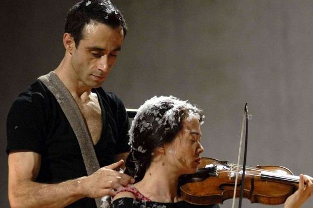 Les Saisons dans leurs Eléments Voici une soirée assurément iconoclaste et surprenante, que ce spectacle créé par Juan Kruz Diaz de Garaio Esnaola au Radialsystem V à Berlin en 2007, dont le DVD est paru chez Harmonia Mundi l'an dernier, et qui désormais prend possession de la scène prestigieuse de l'Opéra Royal versaillais. Soirée risquée également, que celle de la réinvention visuelle du cycle de danse de Rebel si célèbre pour les dissonances de son Chaos initial, et des Quatre Saisons tant jouées qu'un soupçon de banalité commerciale s'y attache désormais. Et si l'on évoquera nos divergences esthétiques sur la mise en scène des Eléments, ce sera pour mieux célébrer l'originalité et la poésie épurée des Quatre Saisons, véritablement redessinées sous nos yeux avec un art du théâtre d'une franchise minimaliste gracieuse. Commençons donc par des Eléments où l'alchimie n'opère pas vraiment en dépit d'une superbe introduction du théorbiste assis dans la pénombre. L'Akademie für alte Musik Berlin fait valoir des attaques précises, et de belles cordes, mais les percussions exotiques et intrusives, un relatif manque de projection et de liant ne parvient pas à faire oublier les performances d'un Marc Minkowski, plus énergique et "français" dans les timbres orchestraux. L'Air pour l'Amour se détache des autres pièces par sa charge évocatrice, tandis que les Rossignolo sombrent dans un écueil trop décoratif. Il faut dire que sur scène Gabriel Galindez Cruz enchaîne des positions déstructurées avec fluidité. Si le Feu où son corps s'orne de lumignons s'avère saisissant, avouons notre peu d'appétence pour la Terre et l'Eau, où après s'être enduit le corps de mottes de terre brune, la souple danseur se dévêt en slip blanc moulant pour sautiller dans un micro bassin. Les Quatre Saisons furent d'un autre airain, tant musical que visuel. Et pourtant le défi paraissait autrement plus dur à relever, puisque les musiciens eux-mêmes, et en particulier le virtuose premier violon Midori Seiler participent à la chorégraphie tout en poursuivant leurs arpèges et doubles-croches. La vision est d'un lyrisme élégant et sobre, entre les musiciens ondulant comme autant de blés, leurs archets pourvus d'une petite feuille, le premier violon ça et là soulevé par la nuque solide de Gabriel Galindez Cruz, transportée de part et d'autre de la scène, recouverte de feuilles mortes ou de neige. Les musiciens s'intègrent dans le concept du musicien-danseur avec jubilation, formant des figures, tournoyant sur des chaises mobiles, se débarrassant en offrande à la cheminée de leurs partitions et de quelques instruments voués au bûcher salvateur d'une petite lanterne rouge. Et lorsque vient la fin de l'hiver glacial, alors que Midori Seiler se voit recouverte d'un drap blanc qui sera bientôt linceul, l'intégralité de l'orchestre lui aussi bascule sous la nappe blanche et immaculée de la nature indomptée.