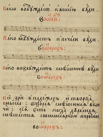 [1]André Lischke, Histoire de la musique russe, des origines à la Révolution, Fayard, 2006, p. 53. [2]André Lischke, op. cit., p. 54. [3]Jérôme Lejeune, notice du disque Konge af Danmark, Alpha 163, 2006, p. 19. [4]André Lischke, op. cit., p. 66. [5]André Lischke, op. cit., p. 68. [6]André Lischke, op. cit., p. 81. [7]André Lischke, op. cit., p. 157. [8]Anatoly Grindenko, "Le chant des anges", dans Harmonie divine : icônes et musique de l’ancienne Russie, Opus 111, coll. “Muses”, 1998, p. 5.