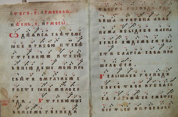 Neumes znamenny - D.R. Dans un premier temps, la polyphonie devait être improvisée : tous avaient sous les yeux la voix principale — une monodie donc, mais pas un "plain chant", une monodie développée — et on pouvait improviser une ou deux voix, au-dessous et au-dessus. "Les premiers chants religieux à deux voix de la fin du XVIe siècle sont les plus proches des principes élémentaires de la polyphonie populaire, tout en offrant des ressemblances avec les organa et les conduits du Moyen Âge, mais sans règles harmoniques précises. L’unisson d’où une voix s’écarte pour cheminer parallèlement ou par mouvement contraire atteste que la polyphonie n’est perçue à ce stade que comme une fissure de l’unisson, et que la hiérarchie n’est pas définie entre consonance et dissonance[4]." Les polyphonies religieuses orthodoxes sont à nos oreilles particulièrement remarquables par la succession de dissonances qu’elles présentent. Secondes et septièmes sont légion, et il n’est même pas rare qu’une pièce se termine sur un accord "dissonant". Dans le chant demestvenny, "la verticalité n’est plus, ou du moins non systématiquement, la règle dominante. Les croisements et les frottements des voix sont la résultante de cette horizontalité, et les effets dissonants donnent parfois une sensation “chaotique”, qui ne peut pour autant être mise sur le compte du seul hasard[5]." Au milieu du XVIIe siècle, une nouvelle forme apparaît, basée sur l’harmonie tonale occidentale. Après plusieurs siècles d’autarcie, la musique russe se voit donc soumise à l’influence des évolutions occidentales. La portée à cinq lignes est adoptée, même si la notation, dans le détail, reste particulière. Le chant dit "partessien" (du mot latin partes, parties), inspiré sans doute par le motet vénitien mais filtré et "slavisé" par la Pologne puis par l’Ukraine, d’où il parvient en Russie. La totalité de la liturgie est rapidement harmonisée dans ce nouveau style. On voit également apparaître "le premier compositeur russe dans le sens moderne, c’est-à-dire polyphonique, du terme[6]", également théoricien, auteur d’un volume intitulé Idée de la grammaire musicale (1675–1679) : Nikolaï Diletski.