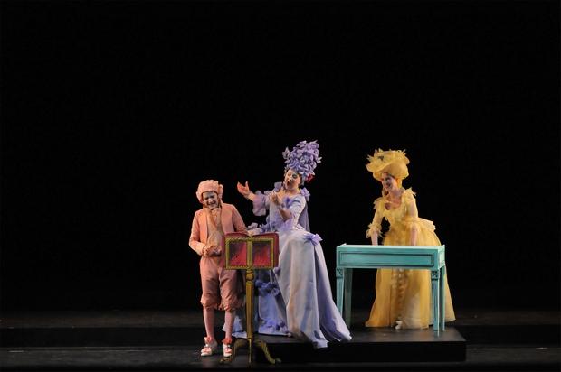 "La seule réalité qui vaille, c’est le plaisir" Après un Couronnement de Poppée raffiné et poétique, Les Paladins s'aventurent en terres classiques et rejoignent cette année Grétry, aux côtés des autres productions que nous avons déjà chroniqué tels Andromaque, L'Amant Jaloux à Versailles ou Paris, Zémire & Azor. L’intrigue de cet opéra-comique en 2 actes est d’une simplicité typiquement XVIIIe : une fille, Lucette, aime un jeune homme, Linval, mais se trouve en butte aux projets de son oncle et tuteur, Dalin — qui finit, une fois le premier barbon désarçonné, par vouloir épouser lui-même la jeune première. L’originalité principale du livret se situe à l’acte I : la tante de Lucette, Madame Saint-Clair, et l’oncle de Linval, Dorimon, attendris, abandonnent tous deux leur projet initial : épouse l’un la jeune première, l’autre le jeune premier ; d’opposants, ils deviennent adjuvants, et se sont eux qui dirigeront la cérémonie de "fausse magie" évoquée par le titre, et dont Dalin sera la dupe (il signera sans le savoir le contrat de mariage…). La note d’intention du metteur en scène Vincent Tavernier, brève et intelligente, annonce le ton : légèreté, fantaisie, sourire, allégresse. C’est une analyse réelle de l’œuvre, de ses forces (la musique et les dialogues) et de ses faiblesses (la conduite de l’intrigue) qui est à la source de ses choix, et il serait à souhaiter qu’une telle méthode se répète plus souvent. En quoi consiste "l’adaptation" de Vincent Tavernier ? Rien de bien alarmant : sans doute quelques répliques coupées, d’autres résumées, mais pas un vers faux. Mieux encore : l’intrigue initiale bancale est "redressée", en faisant disparaître Madame Saint-Clair après l’acte II ; Vincent Tavernier la réintroduit en lui faisant tenir le rôle initialement dévoué à "Une Bohémienne" — ce qu’il signale en toute honnêteté [NdlR : en réalité, le livret a été entièrement réécrit - lire l'interview de Vincent Tavernier à ce sujet]. La partition regorge d’airs et d’ensembles savamment composés, mais aussi de quelques trouvailles (en particulier l’imitation des poules aux hautbois et bassons) habilement intégrées et développées dans la trame musicale. Décors et costumes enchantent de Claire Niquet & Erick Plaza-Cochet : sans être des répliques conformes d’originaux d’époque, ils évoquent le XVIIIe siècle avec une efficacité (chaque personnage est vêtu tout d’une couleur) et une inventivité constantes : chaque changement de décor en devient un nouvel émerveillement comme on n’en voit que rarement. Carton pâte, certes, mais pleinement assumé et séduisant en tant que tel. Le public ne demande qu’à adhérer.