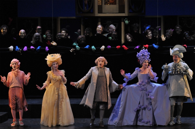 D.R. Les performances des chanteurs-acteurs sont également à louer. Il n’est pas inutile de dire que dans les parties chantées, le texte reste parfaitement intelligible, preuve du travail approfondi sur le chanté-parlé que mène Jérôme Corréas, de Monteverdi à Grétry. Les dialogues sont vraiment joués, et non seulement dits. Jamais rien n’est statique, tout est mouvement, même les grands airs à la "Comme un éclair". Inutile de faire virevolter Lucette ? Qu’à cela ne tienne, l’agitation se fera autour d’elle par les autres personnages, sans gêner, en souriant, en interaction avec elle. Il en va de même du long quatuor de la scène 13, où les protagonistes marchent sur les toits — on n’en voit qu’un seul, mais leurs mouvements, leurs gestes, leurs vertiges, leurs danger de chute nous en dit assez sur ce qu’ils font. Les rôles sont bien campés : Linval et Lucette sont deux jolis petits amoureux, espiègles et pas si niais ; l’oncle Dalin, peu satisfait de sa vieillesse, est plaisant de crédulité ; Dorimon et Saint-Clair, ces deux vieux galants, remportent l’amitié des spectateurs. Il faut avoir vu Anna-Maria Panzarella s’admirer et se parler dans son miroir à la scène II ! Celui qui voudrait trouver des défauts aux voix serait bien en peine. Certes, on pourrait reprocher quelques brèves parties savonneuses dans les coloratures d’Isabelle Philippe, mais si brèves, si brèves… Le chant toujours libre, certaines répliques parlando, tout cela fait continuité avec les dialogues. Les deux ténors sont bien différents : Mathias Vidal est bien jeune premier, même si la voix semble parfois manquer d’assurance et d’agilité (comme le personnage, en somme). Georges Gautier possède une élocution claire, un timbre léger et une belle projection, dans une tessiture homogène. Que dire d’Alain Buet et d’Anna-Maria Panzarella sinon que leurs timbres sont si beaux, et tout est si stylistiquement exact ! Plus généralement, d’ailleurs, cette exactitude stylistique est au rendez-vous chez tous les chanteurs. On n’émettra que quelques réserves sur l’orchestre des Paladins. Sous la baguette inspirée de Jérôme Corréas, l’orchestre se révèle souple et précis, mais accuse parfois un certain manque d’homogénéité et peut-être quelques baisses d’enthousiasme. Qu’importe, ce n’est que parfois et peut-être : la partition est impeccablement jouée, avec souvent de beaux accents. Voilà donc une production exemplaire qu’on résumera de manière lapidaire : bon chant, bon orchestre, bon théâtre, une œuvre rare et presque inédite, une mise en scène comme on rêve d’en voir. Rêvé éveillé, cette fois.