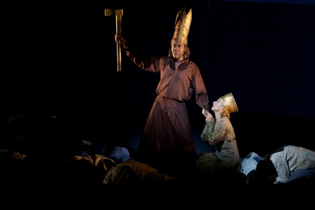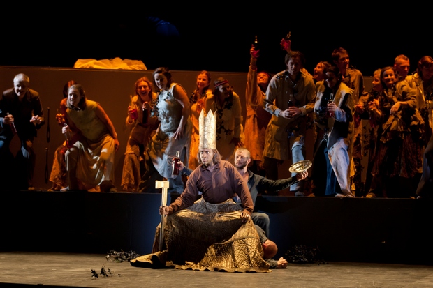 Belshazzar : Kenneth Tarver / Nitocris : Rosemary Joshua © Patrick Nin Dans la sobre salle vert et or du Capitole aux trompe-l'oeil à l'antique, René Jacobs imprime aussitôt un rythme fluide et dynamique à une Akademie für Alte Musik aux cordes onctueuses. En fond de scène, des gradins noirs campent un décor austère qui sert aussi de prétexte aux déplacements des chanteurs. Mère émouvante qui annonce le drame, Rosemary Joshua (Nitocris) exprime ses craintes de sa belle voix de soprano, à la projection assurée et à la diction précise ("Vain, fluctuating state of human empire !"), qui se poursuivent en une émouvante prière ("Thou, God most high"). Changement de décor avec l'irruption des choeurs entourant Cyrus et Gobrias, qui raillent avec puissance une entreprise militaire qu'ils croient vouée à l'échec ("Behold, by Persia's hero"). Jonathan Lemalu (Gobryas) pleure la mort de son fils d'une voix profonde de basse, à l'ampleur un peu limitée dans ce premier air ("Oppress with never ceasing grief"). Lui répond alors de son timbre aigu, légèrement acidulé, le contre-ténor Bejun Mehta (Cyrus), au phrasé impeccable qui se projette en superbes ornements ("Dry those unavailing tears"). C'est un Gobryas cette fois en pleine possession d'une projection puissante qui entame le "Behold the monstrous human beast", saisissant dans les profondeurs drmatiques. Devant les Juifs assemblés, Daniel (Kristina Hammarström) lit la longue prophétie qui annonce la victoire prochaine de Cyrus ("O sacred oracles") de son timbre légèrement mat, dans un phrasé délicat et bien ourlé qui réjouit nos oreilles. Puis un Belshazzar (Kenneth Tarver) au regard halluciné appelle à la préparation du banquet, allant chercher dans sa voix de ténor les graves requis par la partition, et annonce une bacchanale endiablée ("Let festal joy") qui culmine avec une danse forcée avec sa propre mère qui résiste d'une voix innocente devant ces préparatifs de débauche ("The leafy honours"). Le duo qui suit est bien rythmé sous la baguette de René Jacobs, attentive à soutenir sans faiblesse le moto dramatique. L'acte II s'ouvre sur le bel air de Cyrus, ajouté du remaniement de 1751 ("Great God !"), superbe prière strophique d'un Mehta recueilli, suivie d'un chœur dense des Perses ("See from his post"). Mehta, impérial et jubilatoire, lance alors son appel à l'assaut de Babylone ("Amaz'd to find the foe so near"), repris par un choeur galvanisé ("To arms !"). Par contraste, le choeur de réjouissance des Babyloniens au banquet ("Ye tutelar gods") ouvre la bacchanale, dans un superbe éclairage orangé qui rend la scène qui presqu'irréelle. De son timbre puissant, Belshazzar appelle à son tour aux libations ("Let the deep bowl"), interrompu par...la descente des cintres de son double inanimé, et l'inscription sur le mur de signes inconnus. Stupeur ! Le roi manque de s'évanouir, appelle ses sages qui arrivent, précédés d'une symphonie brillamment exécutée par l'Akademie für Alte Musik, mais se révélent incapables de déchiffrer la prophétie. Daniel, appelé sur le conseil de Nitocris, intervient : Hammarström déclame de son timbre sombre le sens de la prophétie ("Yet to obey"). Dans un clair-obscur saisissant, Rosemary Joshua, touchante de compassion, appelle son fils au remords sur les plaintes des théorbes ("Oh sentence too severe !"). De son timbre de contre-ténor à l'admirable stabilité, Mehta savoure maintenant sa victoire proche, et appelle ses troupes à la clémence ("Oh God of Truth"), repris par un chœur martial appuyé par les tambours.