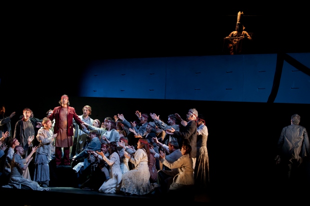 Un Belshazzar triomphal ! Créé en 1745, Belshazzar connut une seconde série de représentations en 1751 à Covent Garden, dans une version remaniée et allégée, puis une troisième production en 1758. René Jacobs a choisi de reprendre la version originale de la création, augmentée d'un air de Cyrus extrait du premier acte de la seconde version et replacé au début du second acte. Pour la composition du livret, le Cher Saxon avait fait appel à un mécène et érudit de l'époque, Charles Jennens (qui composa également le livret du Messie). Celui-ci, pétri de foi envers la religion chrétienne, a puisé ses sources dans des textes bibliques (livres de Daniel, d'Isaïe et de Jérémie, Psaumes) mais aussi des textes historiques (d'Hérodote et Xénophon). Grâce à un génie théâtral incontestable, il en assembla les éléments les plus saisissants (conquête de Babylone par Cyrus II, festin de Balthazar, inscirption d'une prophétie sur un mur) pour construire un enchaînement dramatique inexorable, commandé par la volonté divine. L'efficacité en est renforcée par une trame très épurée. Au premier acte, tandis que Nitocris, mère de Belshazzar, craint la chute de l'empire babylonien, les Perses et les Mèdes assemblés devant la ville préparent leur entrée triomphale, qu'ils projettent d'effectuer lors de la fête païenne de Sésach. De leur côté, les Juifs captifs rassemblés autour de Daniel écoutent la prophétie de leur libération prochaine. Impavide, Belshazzar prépare dans son palais un somptueux festin pour les festivités païennes, sous les reproches de sa mère. Au second acte, après que les Perses aient réussi à détourner le fleuve qui protège la ville, Belshazzar s'adonne à son banquet, en buvant dans les coupes sacrées prises dans le Temple de Jérusalem. Une prophétie s'inscrit alors sur les murs, que seul Daniel peut interpréter :"compté, pesé, divisé". Les jours de règne de Belshazzar sont comptés, ses minces actions pesées, son royaume sera divisé entre Mèdes et Perses ! Tandis que Cyrus envahit la ville, Nitocris supplie son fils de se repentir. Au troisième acte, tandis que sa mère attend toujours un geste de remords, Arioch annonce que Belshazzar a choisi de poursuivre le banquet impie. Cyrus est désormais dans les murs du palais, et Belshazzar décide de l'affronter mais périt dans le combat. Victorieux, Cyrus fait preuve de clémence, et annonce qu'il rebâtira la cité des Juifs. Les décors contemporains dépouillés de Roland Aeschlimann mettent en valeur ce livret riche en événements. L'intensité dramatique est amplifiée par la mise en scène très explicite, parfois osée (les simulacres d'acte sexuel de Belshazzar sur un jeune danseur, ou sa danse incestueuse avec Nitocris, lors des préparatifs du banquet...) de Christof Nel, dont l'efficacité est soulignée par les éclairages contrastés d'Olaf Freese. Les costumes de Bettina Walter, soignés, sont assez intemporels pour ne pas choquer par une modernité excessive ni verser dans une antiquité de pacotille. Certains sont cependant bien improbables, comme la tenue militaire de Cyrus (au deuxième acte), agrémentée d'une étrange jupette orange ! A noter en revanche les hautes coiffes dorées de Belshazzar, un peu improbables elles aussi, mais tellement évocatrices d'une antiquité revue à la mode baroque !