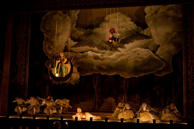 Frédéric Antoun : Hippolyte / Allyson McHardy : Phèdre © Patrice Nin Avec ses tentures en trompe-l'œil dans le goût du Consulat, la salle du Capitole est le sobre écrin de ce spectacle raffiné. Ivan Alexandre a magnifiquement tiré parti de cette succession de situations, et des nombreux rebondissements de l'œuvre, en les replaçant dans le goût du XVIIIe siècle. Le journaliste et critique, passé de l'autre côté du rideau, a déclaré vouloir exalter la forme, sans pour autant pratiquer une reconstitution historique à proprement parler. "J'accueille avec enthousiasme les divertissements, la danse, les toiles peintes, les feux de la rampe, les machines, le déluge des divinités, je m'efforce de suivre le librettiste et le musicien dans l'extrême théâtralité comme dans l'extrême anti-théâtralité" confesse t-il. Et, un peu dans la lignée de l'Orfeo de Gilbert Deflo au Liceu de Barcelone, le metteur en scène nous propulse dans une atmosphère pastel, très inspirée de Nattier ou Fragonard, d'une douceur dorée grâce aux éclairages d'Hervé Gary. Dès l'Ouverture, les scènes champêtres bénéficient des délicats bocages d'Antoine Fontaine, qui mettent en valeur les ballets délicatement - et symétriquement - chorégraphiés de Nathalie Van Parys. Les décors classiques (Temple de Diane, Palais de Thésée) sont représentés par de gigantesques trompe-l'œil, dont l'architecture majestueuse et complexe fait honneur aux lavis de l'époque, mélange inspiré consciemment ou non de Ledoux, Gabriel ou encore Piranèse. Les toiles peintes tombent ou se dérobent lors de changements à vue toujours aussi impressionnant qu'à l'époque. Et, en dépit de tous les effets spéciaux numériques ou vidéos dont nous sommes de nos jours abreuvés, un Palais qui s'envole ou Diane et Jupiter descendant des cieux dans leurs gros nuages cintrés demeurent inégalés. La voûte des Enfers au second acte, avec sa perspective fuyante, a représenté un summum en la matière. Seul le monstre marin du IVème acte était bien plus détaillé et convaincant sur les esquisses que sur scène, et cette sorte de tente munie de dents engloutissant avec délectation l'emperruqué Hyppolite tombait un peu à l'eau, si vous voulez bien nous passer l'expression. Les costumes de Jean-Daniel Vuillermoz répondent à ces décors, d'une facture opulente et soignée, avec abondance de paniers, broderies, perruques, plumes. Les justaucorps masculins eux-mêmes possèdent une armature rigide, sorte de jupe exagérée par rapport aux plis tombants historiques, réminiscence des costumes de Piet Halmen pour Ponnelle dans sa Clémence de Titus ou son Mitridate ? Face à ce cortège de bergères aimables, poudrées et aux lèvres toutes de rouge sensuellement habillées, se détache Phèdre et sa robe écarlate, sa rigide fraise dont elle se défera à mesure qu'elle avouera son coupable amour. De même les séquences infernales aux démons vêtus de noir et rouge contrastent avec les tons verts et orangés des bois enchanteurs.