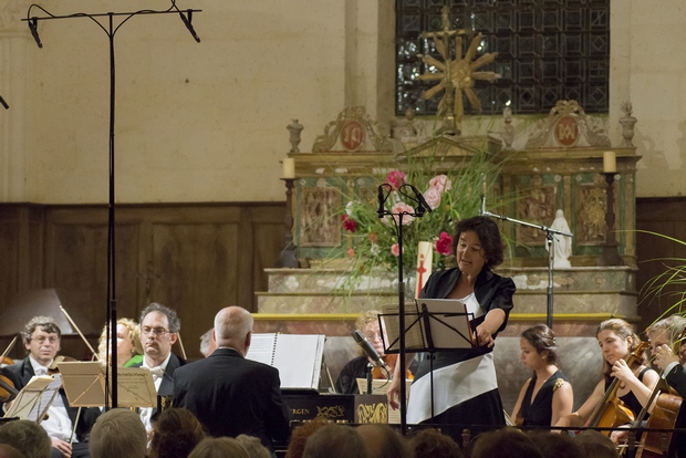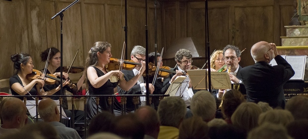 Il fait encore très beau. Les douceurs des spécialités culinaires locales continuent de se mêler aux effluves champêtres. Les sourires et la décontraction n’ont pas quitté les visages autour de la charmante église romane et c’est donc pour terminer une très belle journée "baroque en Cercles" que Ton Koopman et son Amsterdam Baroque Orchestra investissent l’autel. Deux cantates et deux Brandebourgeois sont au programme pour une soirée où le sacré et le profane se marieront en musique. Dès l’entame de la Cantate BWV199 "Mein Herze schwimmt im Blut" on sent les cordes emmener brillamment l’ensemble dans une interprétation énergique. Elles ne manqueront jamais de subtilité ni de précision dans l’attaque malgré une texture généreuse et charnelle. Qu’il soit ou non doublé par le clavecin, chaque mouvement de basse maintient cette double impression d’enjouement et de rigueur métronomique. Malgré son envie et sa très belle voix, Bettina Pahn semble parfois en difficulté lors de cette première oeuvre du programme. On le ressent surtout dans certains passages virtuoses où quelques notes aigues ne seront pas tout-à-fait atteintes. Son timbre et son style paraissent mieux s’accommoder des moments plus posés, des airs où l’émotion et l’expressivité l’emportent sur la cavalerie technique. Plus à son aise dans la Cantate BWV 202 "Weichet nur, betrübte Schatten" qui clotûre la soirée, elle interprètera d’ailleurs parfaitement ce sublime premier air, semblant émerger des arpèges de cordes et du hautbois introductif avec une grande sensibilité dans ce petit morceau qui nous rappelle, au cas où l’on serait distrait, que Bach avait le sens du « tube » en plus de sa science vertigineuse. On notera pendant l’air "Sich üben im Lieben" la prestation de l’oboïste Antoine Torunzcyk. Après avoir distillé avec grâce les ribambelles de doubles-croches qui soutiennent le chant il se rassoira, amusé autant qu’épuisé.