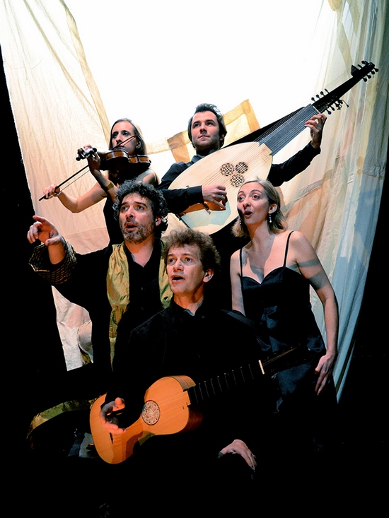 Ensemble Faenza Marco Horvat, baryton, théorbe et guitare baroque Olga Pitarch, soprano Serge Goubioud, ténor Damien Pouvreau, théorbe Prisca Stalmarski, violon baroque Caroline Guth, mise en scène Frédéric Boileau, lumières Elsa Marc, scénographie Shakuntala, collaboration artistique