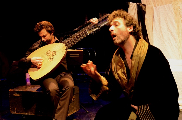 Ils ont imaginé Castaldi, au soir de sa vie, souffrant de sa blessure au pied — il s’y est pris une balle en cherchant à venger l’assassinat de l’un de ses frères —, se remémorant quelques épisodes de sa vie et beaucoup de musique. Car c’est bien à la musique que Les Voyages de Bellerofonte sont voués : la musique est au centre, le théâtre s’organise autour d’elle, la met en scène, sans afféteries ni prétentions démesurées. Le tout est habilement rythmé, ne laissant pas de temps morts, ni ne précipitant rien. À aucun moment tout cela ne paraît trop artificiel, tout est amené avec art, et d’ailleurs, le dispositif dramaturgique n’hésite pas à utiliser le fait que Castaldi était musicien pour le montrer se livrant à des soirées musicales avec sa compagnie d’amis “musiphiles”, comme il l’écrit lui-même — ce qui donne le temps de poser de longues pièces musicales.