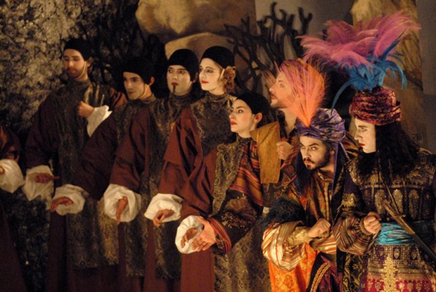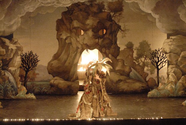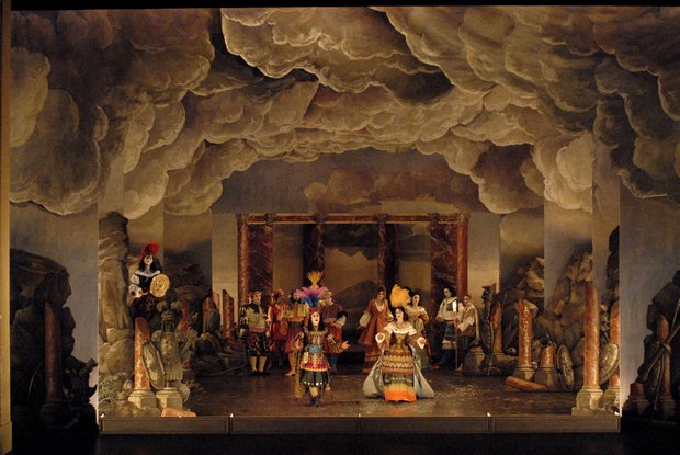 © Elisabeth Carecchio Dès l’Ouverture, l’orchestre promet que le spectacle sera beau. Porté par la puissance des bassons et couronné de l’éclat des hautbois, il démarre l’action aussitôt et nous entraine à sa suite. Cette fougue narrative perdurera tout au long du spectacle, assurant un rôle moteur entre les parties chantées et le bon enchainement des différentes pièces. L’orchestration changeante renouvelle à chaque instant le caractère de l’œuvre de Lully ; les musiciens jonglent allègrement entre basson, flageolet, hautbois ou cornemuse, pour le plus grand plaisir de la vue et de l’ouïe. A cette riche pâte sonore, il manque cependant l’engagement des dessus de cordes qui restent parfois un peu en retrait des basses et des vents. Lorsque le rideau se lève, la magie du théâtre baroque opère instantanément. Les teintes de verts, de gris, de roses et de bleus sont magnifiées par l’éclairage chancelant des bougies ; cette atmosphère à la fois douce, chaleureuse et pleine de lumière flatte le regard par la variété infinie de ses contrastes. L’or du Soleil, des danseurs (Acte II, Scène 6) et des décors vient ourler ces couleurs soyeuses, dénuées du caractère agressif que leur donnerait éclairage électrique. Au sein de ce décor précieux évoluent les différents personnages, vêtus de costumes aussi riches que divers. Si les chanteurs ne présentent dans l’ensemble pas de faiblesses vocales notoires, nous restons quelque peu désappointés par la petitesse du son de la plupart, qui doit sans doute être imputée à l’importance des décors et à la place des chanteurs sur scène. Arnaud Marzorati, le premier, se singularise par une émission plus puissante et par la force de sa présence scénique. Incarnant successivement le dieu Pan et Arbas, valet de Cadmus, c’est vraiment dans la personne de ce-dernier qu’il trouve matière à expression de ses multiples talents de comédien et de chanteur. Passé maître dans l’art de la pantomime, il exacerbe les caractéristiques de son personnage de serviteur couard, vaniteux et grotesque par des jeux d’opposition et de contrastes, mais sans jamais céder à la vulgarité ou à la facilité. Le baryton est ainsi parvenu au subtil équilibre d’une voix agile et bien posée alliée à un jeu scénique très engagé au service du texte et de la musique. Le contre-ténor Jean-François Lombardi le poursuit dans son rôle de vieille nourrice et le presse par sa voix suave de céder à ses charmes, donnant lieu à des échanges piquants et pleins d’humour ("Quand tu parlois seul à Charite/Le temps ne pressait pas tant. /Quel charme a-t’elle qui t’attire ?/Qu’ay-je qui te fait t’en aller ? – J’avais à lui parler, / Je n’ay rien à te dire." Acte II, Scène 2) ; tous deux forment un couple qui contrebalance la gravité des cœurs de Cadmus et d’Hermione et atténue l’impression de tragique.
