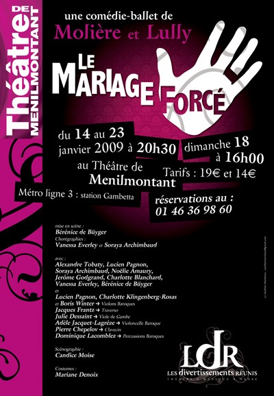 Une union divertissante Habituée aux ors et à l’ambiance feutrée des vieux théâtres parisiens, Muse baroque a exceptionnellement franchi l’enceinte de Louis XIV pour s’arrêter dans l’ancien village de Ménilmontant. La cause en est noble, puisqu’il s’agissait d’assister à la représentation d’une comédie-ballet de Molière et Lully, interprétée par la jeune troupe des Divertissements Réunis. Il est en effet trop rare de nos jours de pouvoir assister à ce genre de représentations, qui marient la comédie aux "Airs et Symphonies de l’incomparable Monsieur Lully, mêlés à la beauté des Voix, et à l’adresse des Danseurs". Entre 1661 et 1671, Molière a pourtant créé rien de moins que 13 pièces de ce type, dont Le Mariage Forcé, première collaboration complète entre les deux amuseurs du Roi en 1664. C’est donc avec le projet fort louable de réunir sur scène les trois arts majeurs que sont la musique, le théâtre et la danse et de faire revivre l’alchimie bouillonnante et légère de cette époque des débuts galants du Roi-Soleil que le metteur en scène Bérénice de Büyger a réuni autour d’elle une quinzaine de passionnés polyvalents. L’intrigue du Mariage Forcé repose sur un canevas brossé fort simplement : Sganarelle, bourgeois d’un âge certain, s’éprend de l’aimable, jeune et jolie Dorimène et émet le désir de l’épouser, en dépit des avertissements sensés de son ami Géronimo (sic). Suite à un entretien avec sa future femme, notre bourgeois, saisi de doute et d’effroi cède aux morbides inquiétudes sur les dangers du mariage - notamment au cours d’un affreux songe – aspire à prendre conseil auprès d’une galerie de personnages hauts en couleurs. Il souhaite alors se rétracter et se retrouve enfin provoqué en duel par le frère de sa promise.