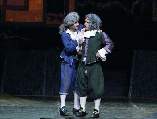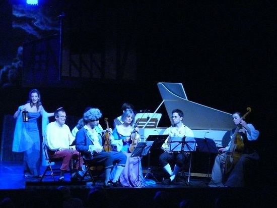 © Les Divertissements réunis Et la musique de Lully dans tout cela ? Sur le plan vocal, celle-ci repose entre les fragiles mains d’une unique chanteuse. Mise en valeur par un éclairage dépouillé qui accentue sa visibilité, la damoiselle fit parmi les comédiens une apparition aussi féerique qu’éphémère, et son interprétation dans son rôle de magicienne demeure hésitante. L’orchestre est quant à lui porté par un premier violon qui manie aussi bien l’archet que la langue de Molière - puisqu’il interprète également le rôle de Géronimo – et l’on admire des articulations intelligentes et des attaques assurées. Les autres musiciens des Divertissements réunis qui jouent, rappelons-le, sur instruments d’époque semblait discret, en retrait, affichant parfois une justesse relativement… personnelle. Il est dommage que la délicate viole de gambe se soit montrée si timide et la flûte n’ait pas eu l’occasion de s’affirmer plus au sein du noyau de cordes. Enfin, sans entrer de nouveau dans les polémiques récurrentes autour de l’utilisation du français restitué, on aurait apprécié entendre les mots de Molière prononcés avec les sonorités chantantes de jadis, ce qui aurait renforcer l’aspect pittoresque et comique de la pièce. Alors que le souhait du metteur en scène était de “se rapprocher le plus possible de la structure originale” de la comédie, on aurait pu imaginer qu’elle aurait voulu aller jusqu’aux confins de la recréation. L’objectif du tandem Molière-Lully, comme celui des Divertissements Réunis est atteint : nous fûmes diverties par un spectacle frais et sans prétention, d’une souplesse printanière. Mais si l’implication des protagonistes était bien visible, les noces des arts baroques, comme celles de Sganarelle et Dorimène, ont conservé ce soir-là un arrière-goût d’inachevé.