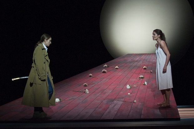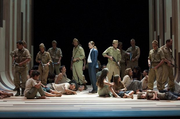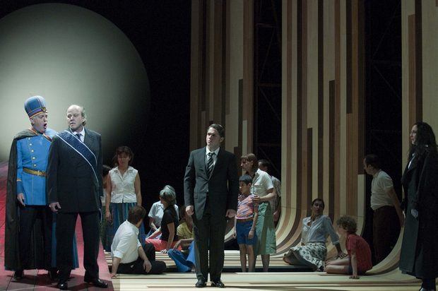 On a tous en tête l'Idoménée de Jean-Pierre Ponnelle, immortalisé par la captation vidéo d'un Pavarotti plus royal que nature au milieu des gravures grandioses de Piranèse, alors que les protagonistes semblent sortir d'un tableau décadent d'Hubert Robert. Stéphane Braunschweig a opté ici pour une approche plus sobre, assez inégale. Si les panneaux coulissants de bois qui composent et recomposent les espaces, figurant ici une salle du trône, là un navire sont élégants et rappellent discrètement les châssis mobiles du XVIIIe, si la sphère mystérieuse et son chemin écarlate et sanglant se révèlent efficaces et évocateurs, quoiqu'abstraits, les costumes et la direction d'acteurs s'avèrent plus mous et convenus. Ainsi sous les ciseaux de Thibault Vancraenenbroeck, les personnages sont enfoncés dans le réalisme d'une Grèce des 70's, où les militaires vert-olive rencontrent des peuples vêtus de manière miséreuse. Dans ce monde peu coloré, d'une ordinarité froide et désincarnée, les prêtres de Neptune et leurs uniformes d'opérette bleu azur apportent une touche de fantaisie, presque déplacée. Les déplacements et la gestuelle sont encore très hiératiques et traditionnels, et le metteur en scène n'a manifestement pas su, contrairement à la sublime musique de Mozart, se départir d'un certain statisme, qui conduit les chanteurs à se retrouver simplement face au public pendant leurs plus ou moins longs airs. Enfin, on protestera contre le portrait d'un Idamante en jeune caïd immature, nerveux, bourré de tics, à contre-sens des nobles paroles que le livret lui prête, notamment dans la scène de libération des prisonniers.