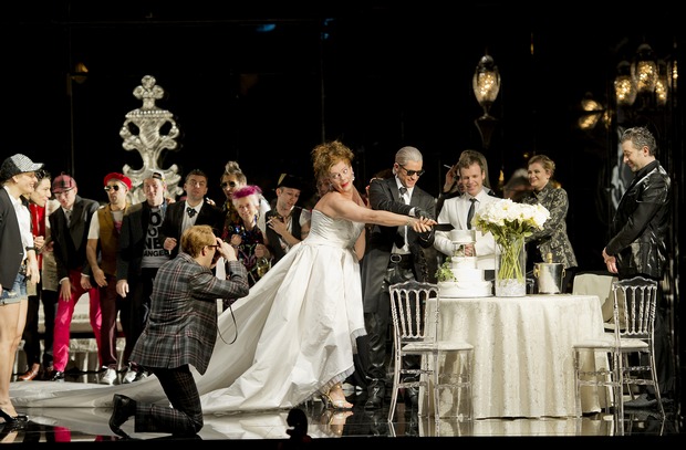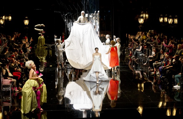 Marcel Beekman (Platée), Simone Kermès (La Folie) & A. Schoenberg Chor (représentations de Vienne) © M. Rittershaus Fashion victim C'est à une relecture d'une efficacité endiablée, maîtrisée, un brin cynique, renouant avec la nature satyrique du livret que Robert Carsen s'est attelé. Exit la grenouille des marais et de ses facéties auxquelles nous nous étions habitué, Carsen revient aux sources du livret et la Nymphe régnant sur les marais se mue en laideron sur le retour, moqué dans une société du paraître, entre clubs branchés, défilés de haute couture et hôtels de luxe. On retrouve les affinités du metteur en scène pour les miroirs, les reflets argentés, la transparence brillante qu'il avait déjà introduits pour Armide, alors que références et clins d'œil abondent avec cette galerie, souvent cruelle mais juste, de portraits iconiques d'une société du paraître où les designers et créateurs ont remplacé les fashionistas de la Cour. Voici donc un Jupiter Karl Lagerfeld plus vrai que nature, une Junon Coco Channel (y compris avec la bonne tête de lit), un Mercure très YSL, sans compter les personnages secondaires que nous n'énumèrerons pas mais qui souvent sont inspirés de figures bien connues du monde de la mode.