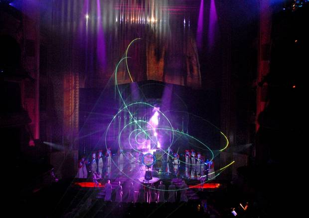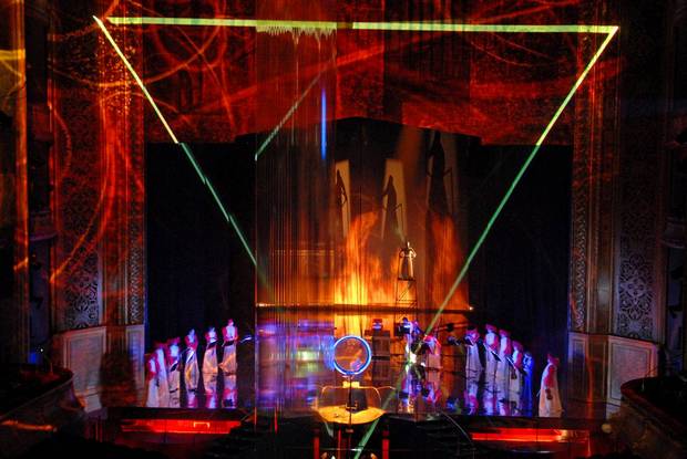 © Théâtre du Chatelet, 2009 Et pendant près de deux heures Kulik transporte l'auditeur dans un kaléidoscope touffus, dont les clefs symboliques mélangent allégrement les couleurs et les signes, brouillant un discours aux multiples références sous la monumentalité de tableaux saisissants, où la technologie parvient à se faire oublier au profit de jeu de lumières, de projections, de lasers, de miroirs. Sur scène - mais la délimitation de l'espace elle-même est dépecée, grâce à une spatialisation constante du placement des solistes, et des "processions" traversant le parterre - les musiciens arborent des tuniques sinisantes rouge et blanche, et les délicats couvre-chefs aux pendeloques tombantes rappellent le parfum des palanquins, dirigés par un Jean-Christophe Spinosi en grand prêtre encapuchonné de mauve. Alors que s'élève des vapeurs inodores mais qui semblent figurer l'encens, les solistes et choristes, revêtus de robes immaculées aux drapés hiératiques, la tête serrée dans une espèce de coiffe fermée de nonne ou de marchand vénitien, célèbrent un rite inconnu, jonction entre l'Orient, la Renaissance et un futur cosmique. Le temps et l'espace se dissolvent alors dans un ailleurs incertain et obscur. Nos lecteurs qui n'étaient pas présents à cet "ailleurs" débordant d'inventivité et à la limite du rationnel ne comprendront pas grand chose à cette chronique, dont les illustrations valent plus qu'un long discours. Et l'abstraction géométrique des projections, la gestuelle inexplicable des chanteurs, le spectre des couleurs sans cesse changeantes ouvrent justement la porte à l'imagination, et à l'interprétation. Le livret comporte les croquis et les notes de Kulik, et l'on découvre avec effroi que l'on a par exemple manqué la barbare vision d'animaux égorgés : "En haut, au-dessus de la salle, des bœufs gigantesques à trois pieds (un ou deux ?), avec la gorge coupée, sont suspendus par les pattes de derrière et secoués par une danse-convulsion au ralenti. Des flux de sang, en tombant, se transforment en serpents, et les serpents en drapeaux." Et c'est tant mieux.