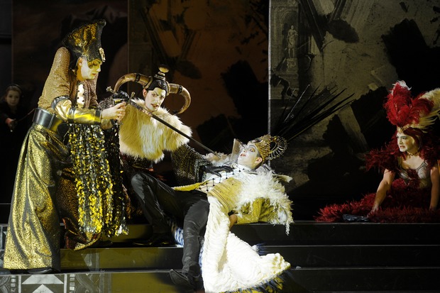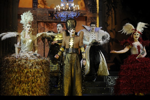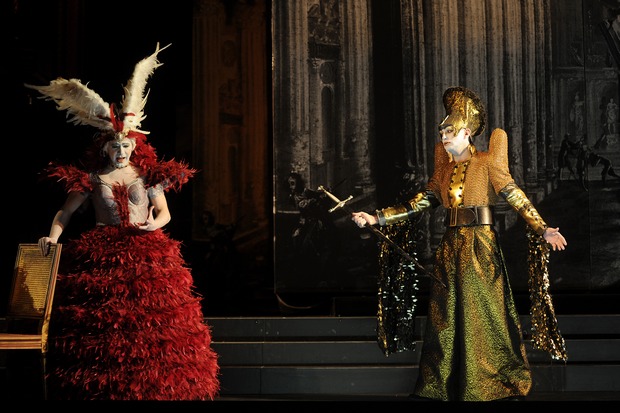 Dans le rôle de Semira, Valer Barna Sabadus fait une entrée remarquée sur la scène lyrique française. Il surmonte sans peine son travestissement, et son jeu d’acteur est tout à fait convaincant. S’il conserve un timbre nettement plus cuivré que Cencic, qui nuit un peu à sa crédibilité vocale, il joue avec bonheur d’un phrasé enjôleur (en particulier dans l’air « Torna innocente e poi », au premier acte, sur un bel accompagnement de guitare), et sa projection s’impose sans peine face à l’orchestre. Les deux airs du second acte ravissent les spectateurs, avec les attaques incisives du « Se del fiume altera l’onda » qui suivent un récitatif très soigné, et l’exquis désespoir du « Per quell’affetto », qui déclencheront de justes applaudissements. Ajoutons que la mise en scène de Silviu Purcärete offre un écrin sombre et dépouillé aux costumes fastueux d’Helmut Stürmer, renouvelés à presque chaque apparition des chanteurs : sol et murs noirs, avec un plateau tournant au centre de la scène qui anime astucieusement les chorégraphies, et des loges de maquillage sur les côtés, clin d’œil au spectacle qui nous est offert. Autre allusion facétieuse, la reproduction du dessin de l’Homme par Vinci (l’autre Léonard) orne le fond de la scène. Les lumières discrètes jouent sur les clairs-obscurs, dans un souci légitime de restitution de l’atmosphère d’une représentation de l’époque. Saluons aussi les coiffes somptueuses de Cécile Kretschmar, qui puisent tour à tour leur inspiration entre une antiquité perse revisitée et des perruques du plus pur baroque. Malheureusement les représentations prévues en tournée à Vienne, Lausanne, Paris (théâtre des Champs-Elysées) et Cologne au cours des prochains mois seront privées de ce délicat decorum, car elles sont programmées en version de concert. Enfin, pour ceux qui n’auront pu assister à cette production mémorable, un enregistrement avec la même distribution (sauf le rôle de Mégabise, confié à Daniel Behle) vient de paraître chez Virgin Classics.