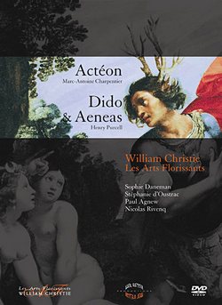 Il n’y a pas à dire : Dido and Aeneas est une œuvre plus marquante qu’Actéon, même si celui-ci n’est pas sans mérites. D’ailleurs, il est plutôt bien représenté ici : Paul Agnew est en forme et ses deux principales interventions (dont un grand air) sont magnifiquement exécutées. Malheureusement, la Diane de Sophie Daneman est incompréhensible dans sa diction et peut se flatter d’une voix sans aucune profondeur. Lui donner le second rôle de cette œuvre relève presque du gâchis. Les chœurs, qui font la force de cette œuvre, sont sans défaut. Il faut dire que l’idée d’effectifs réduits les met en valeur : pour une œuvre de si courte durée, un petit orchestre renforce le caractère intimiste de la performance. Car William Christie a choisi de nous présenter les deux courts opéras avec un effectif extrêmement réduit : un instrumentiste par pupitre (à l’exception de la basse), les cordes secondées uniquement de deux flûtes à bec et de deux hautbois. Mais rassurez-vous, la basse continue ne noie pas les autres dans son flot continu ; non, le défaut est ailleurs : c’est l'inexistante mise en scène, car nous sommes confrontés à une version de concert maladroitement mise en espace qui dessert les œuvres par son amateurisme brouillon. Le Dido and Aeneas en souffre beaucoup encore plus que l'Actéon. Il suffit de prendre la scène des Sorcières comme illustration de ce discours peu lisible. William Christie nous fait savoir dans le petit documentaire qu’il a voulu renforcer le caractère inquiétant et étrange de l’Enchanteresse en confiant le rôle à un contre-ténor. Hélas, Michel Puissant n’est pas Dominique Visse et tout cela devient franchement ridicule et insensé, car ce Monsieur en fait un peu trop. Il essaie de jouer la femme, mais il n’a pas à l’évidence les qualités de jeu de Paul Agnew en Platée. L’autre moment très attendu est évidemment la plainte finale. Sans être ratée elle aussi, elle n’est pas vraiment réussie. Stéphanie d’Oustrac est une excellente Didon, je l’ai déjà dit, et le drame se lit sur son (très beau) visage. Mais comment se fait-il que Belinda (encore Sophie Daneman) ait un grand sourire aux lèvres tandis que se meurt sa maîtresse ? De plus, l’orchestre n’y est pas aussi excellent que dans les versions discographiques réalisées par William Christie (chez Harmonia Mundi avec Guillemette Laurens, et chez Erato avec Véronique Gens) : il ne sait pas laisser suffisamment de place à Didon, dont la voix se trouve du coup parfois un peu submergée par les instruments. Vraiment dommage ! Ajoutez encore que les deux documentaires, s’ils apportent quelques informations intéressantes, ne sont pas d’une très grande utilité aux amateurs du baroque qui connaissent forcément déjà les deux opéras présentés, et que le prise de son est relativement médiocre, et vous aurez compris que le jeu n’en vaut pas la chandelle… Une curiosité, tout au mieux !