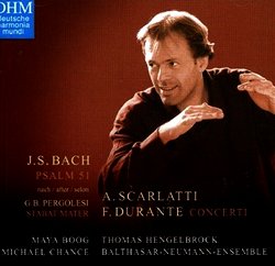 | Genre : musique religieuse Jean-Sébastien Bach (1685-1750) Psaume 51 BWV 1083 , "Tilge, Höchster, meine Sünden" d'après le Stabat Mater de Pergolesi (+ 2 concerti de Scarlatti et Durante) Maya Boog (soprano), Michael Chance (contre-ténor). Balthazar-Neumann-Ensemble, dir. Thomas Hengelbrock.