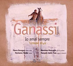 Il y a d'abord la mirifique prise de son. Un son large, évocateur, fenêtre sur la lagune laissant s'engouffrer l'air frais d'un matin blême. Même en étant habitué aux excellentes captations de chez Alpha ou Alia Vox, on reste ébahi et admiratif par le savoir faire de Franck Jaffres et Alban Moraud qui concilie une vision globale naturelle et l'impression de se tenir à quelques mètres des musiciens. C'est la viole langoureuse de Marianne Muller, rêveuse et cursive qui ouvre le bal d'un court Ricercar. Et dans le motet suivant de Willaert, la flûte de Pierre Boragno et l'orgue de François Saint-Yves mêlent si intimement leurs timbres qu'on est troublé par cette fusion et les harmoniques qu'elle produit. Mais nous nous égarons, car le lecteur se demande d'abord peut-être - et à juste titre - qui est ce fameux Ganassi et ce que recèlent ses traités. De petite extraction, Sylvestro Ganassi dal Fontego obtint en 1516 la charge de piffaro du doge de Venise. D'après Pierre Boragno, le fait qu'il ait tenu la partie de contralto tend à prouver qu'il a été tromboniste. L'homme est célèbre pour ses 3 traités : Opera intitulata Fontegara dédié au Doge pour la flûte et sur la diminution (Venise, 1535), et Regola rubertina pour la viole(Venise, 1542) et pour la viole et le luth Lettione seconda (Venice, 1543). Certains musicologues, considèrent avec pertinence que la Regola rubertina et la "2ème Leçon" constituent les deux volumes d'un même traité. A ces ouvrages prestigieux s'ajoute un manuscrit contenant 175 redoutables diminutions (décomposition d'un intervalles en valeurs plus rapides). L'œuvre de Ganassi est inestimable pour les chercheurs et musiciens car ces traités d'interprétation, les premiers de la sorte, livrent une multitude d'information sur les coups d'archet, les doigtés et surtout la pratique de l'improvisation et de l'ornementation, avec notamment les fameux passagi. Ganassi a donc pleinement sa place parmi les grands auteurs de manuels sur l'art de la diminution tels Ortiz, Bassano, Bovicelli ou Rognoni, même s'il ne donne pas d'exemples musicaux contrairement à ses contemporains. Ajoutons qu'à cette époque, la distribution instrumentale n'étant pas fixée, elle demeure à la discrétion du goût des interprètes et que les transpositions étaient courantes. En outre, si les diminutions étaient jouées par l'instrument mélodique, elles devaient se voir adjointe la composition d'origine, soit avec d'autres instruments de la même famille, soit sous forme de tablature pour clavecin, orgue ou luth. Nous en revenons donc à cette Venise de 1540 après ces détours informatifs quoiqu'indigestes. D'arabesques en arabesques, on y trouve un charme insidieux, profondément nostalgique. La Fantaisie de Da Ripa transpire la solitude sous les arpèges de Massimo Moscardo, et seul le clavecin ailé de François Saint-Yves apporte de temps à autres un zeste de réconfort dans cet univers clos. En dépit de la virtuosité technique requise par toutes ses diminutions, jamais la lecture ne se laisse aller à l'expressivité simple, démonstrative, à la joute pleine d'excitation et d'espièglerie, sauf peut-être dans le "Vecchie letrose" de Willaert. Il y a un côté beau, noble, triste et grave, fervent et solitaire dans ces parfums d'encens fané. On espère vainement que quelques cornets ou sacqueboutes apportent leurs timbres perçants à ces sonorités magnifiques, d'une froideur humide qui fait frissonner. Voilà donc un disque ambigu et sombre, bienvenu puisque l'art des diminutions a rarement fait l'objet de tant d'attention depuis le récital plus extraverti de "Musique de chambre virtuose du XVIème siècle" de la Schola Cantorum Basiliensis avec Montserrat Fugueras, Jordi Savall, Christophe Coin ou encore Hopkinson Smith (réédition Deutsche Harmonia Mundi d'un enregistrement ancien de 1980). Exemplaire sur le plan de l'exécution, bénéficiant d'une irréprochable et évocatrice prise de son, "Io amai sempre" manque simplement d'une chose : la chaleur d'un sourire.