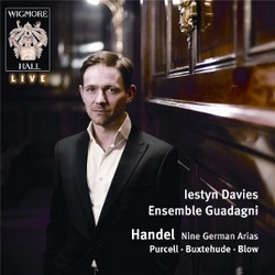 Voici l'un de ces disques auxquels on ne s'attend guère, et qui déclenchent chez le critique blasé un sentiment de devoir à accomplir lorsqu'il pose la galette sur son lecteur : un live avec les risques que cela comporte, une jaquette austère, un contre-ténor peu connu, un ensemble tout aussi mystérieux pour les airs allemands de Haendel prévus à l'origine pour une soprano. Homme de préjugés, mais ravi de les combattre, le critique se cale confortablement dans son fauteuil club défraîchi, et taille son crayon. La ritournelle instrumentale du Jubilate Deo de Buxtehude met en avant l'opulence de l'Ensemble Guadagni pourtant constitué de seulement quatre instrumentistes. Le violon grainé et profond de Matthew Truscott, la viole emplie d'harmoniques douces de Jonathan Manson, le théorbe un brin trop en avant de David Miller, le positif rond de Robert Howarth expriment la mélodie avec fluidité voire nonchalance, dans un lyrisme détendu d'une fraîcheur sage. Et voici que Iestyn Davies entame ses premiers mélisme "Jubilate", faisant valoir une émission assuré, un timbre chaleureux et égal, un phrasé non dénué de noblesse, qui appuie le texte sacré d'une once de dramatisme convaincu ("exulatate et psallite") et une apparente aisance sur toute la tessiture. Ces qualités se retrouvent dans les airs qui suivent, et où le contre-ténor anglais peut, en digne épitôme de Deller, s'autoriser à la griserie du mot, à la sculpture fine des syllabes, établissant un rapport charnel et poétique avec l'auditeur, n'hésitant pas à laisser plus paraître les changements de registre, les hésitations, la fragilité des aigus (pas si fragiles que cela d'ailleurs quand on entend le superbe son tenu sur "crown a lasting verse" dans le Gentle Shepherds de Purcell). Les airs de Purcell et de Blow, dotés d'un accompagnement dont on regrettera la discrétion en en louant l'intimité, s'avèrent atmospheric and tender, et la souplesse de la lecture brouille vite les barres de mesures pour laisser place à un discours volubile et sensible. Qu'en est-il alors des 9 airs allemands de Haendel, qui font partie du peu que le cher Saxon composa en langue teutonne aux côtés de la Brockes / Johannes Passion ou d'Almira ? Certes, il y a là transcription, mais le crime est léger car la pratique courante à l'époque. Et le défi n'est pas facile à relever, après l'interprétation aussi théâtrale que sublime de Dorothea Röschmann (Harmonia Mundi). L'Ensemble Guadagni, plus présent, et avec un violon lové dans ses arabesques, imprime un caractère plus chambriste et plus coloré que dans les airs anglais, plus complexe également. Davies, à l'excellente prononciation germanique (en dépit d'accents forts peu marqués, mais nous ne sommes pas dans Papi fait de la Résistance, pour citer en hors-sujet cette œuvre-culte et un peu lourde du comique français), varie les affects et insuffle davantage de contrastes. Après un "Künft' ger Zeiten eitler Kummer" pastel et alangui, le "Die ihr aus dunkeln Grüften" carré voire brusque, extraverti et virtuose, avec un clavecin énergique, tourne les yeux vers les ors de l'opéra, tout comme le galant "Das zitternde Glänzen" (où le violon accuse des problèmes de justesse) ou le triomphant "Meine Seele hört im Sehen" d'une ferveur souriante et virtuose. On distinguera particulièrement la gravité nostalgique du "Süsser Blumen Ambraflocken" mais l'égale qualité de cet enregistrement est uniformément à recommander. Un disque découverte.