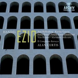 L'intrigue est particulièrement complexe. L'action se déroule en 451, lorsque l'empereur Valentinien III revient victorieux des Champs Catalauniques où il a vaincu Attila et les Huns. L'opéra s'ouvre sur la marche du retour triomphal de l'Empereur, accompagné de son général Flavius Aetius (Ezio). Mais le patricien Maxime, confident de l'empereur, veut se venger de Valentinien, qui a autrefois tenté de séduire son épouse. Maxime va tenter de mettre à profit l'amour d'Ezio pour sa fille Fulvia, en incitant le général à assassiner l'empereur. Celui-ci refuse. Pour provoquer la jalousie des deux hommes, Maxime promet sa fille à Valentinien, et prépare l'assassinat de l'empereur par Emilius, son serviteur. A l'acte II, Emilius a échoué, et Valentinien soupçonne Ezio d'être à l'origine du complot. Il ordonne sa capture à Varus, préfet du prétoire. Fulvia a compris que son père est l'instigateur de cette tentative, elle le conjure de renoncer. Valentinien, flanqué de Fulvia qu'il présente comme sa future épouse, interroge son général. Ezio fou de jalousie accuse alors l'empereur de lui avoir volé sa fiancée. Fulvia finit par avouer son amour exclusif pour Ezio, et celui-ci est jeté en prison. A l'acte III, Valentinien essaie de faire révéler à Ezio les auteurs du complot, en faisant intercéder Honorie puis Fulvia. Ezio refuse de parler. Valentinien doute alors de la culpabilité d'Ezio, tandis que Maxime lui conseille de hâter son exécution. Varo annonce la mort d'Ezio, tandis qu'Honorie annonce qu'Emilius, blessé lors de l'attentat, a disculpé Ezio avant de mourir. Maxime, toujours décidé à se venger, ameute le peuple autour du Capitole. Se voyant menacé, Valentinien appelle Maxime à son secours. Celui-ci accourt mais pour le tuer ; Fulvia s'interpose, bientôt rejointe par Varo et Ezio, dont la mort annoncée n'était qu'un subterfuge. Ezio intercède en faveur de Maxime. L'œuvre s'achève par la clémence de l'empereur envers Maxime, et l'union d'Ezio et Fulvia : ouf ! Alan Curtis offre une lecture musicale très soignée de l'œuvre. Il Complesso Barocco fait preuve d'une belle dynamique sonore dès l'ouverture, majestueuse, et dialogue subtilement avec les chanteurs dans les airs. Les cordes en particulier font preuve de belles attaques, mais celles-ci cèdent à un rythme sautillant, voire saccadé, qui confère à l'ensemble un style un brin académique. Malheureusement, ce sentiment ne fait que s'accentuer à mesure que l'opéra avance : la musique paraît trop lisse, et l'interprétation relativement superficielle, malgré les nuances, ou peut-être plus justement à cause de leur avalanche. Dans les airs comme dans les récitatifs, les chanteurs se coulent dans ce parti pris, ce qui en renforce les effets. Le plateau est globalement d'un très bon niveau vocal, et particulièrement homogène. Sonia Prina incarne un Valentinien au timbre cuivré très plausible, capable de beaux ornements et de nuances délicates (en particulier dans la "Va fida lo sposo" du second acte). Dans les parties plus enlevées ("Se tu la reggi al volo", "So chi t'accese" au premier acte), les projections restent mesurées, mais d'une remarquable stabilité. Ann Hallenberg dans le rôle-titre nous offre des moments d'abandon contenu, ponctués d'ornements aériens (notamment "Pensa a serbami" au premier acte, et "Guarda pria" au troisième). Elle fait montre d'une capacité étonnante à dialoguer avec l'orchestre, qu'il s'agisse des cordes (dans le "Recagli quell'acciaro", second acte) ou des vents ("Se la mia vita", troisième acte). Ce dernier air est d'ailleurs un petit moment d'extase, tant les cors font preuve de délicatesse pour le disputer aux cordes et au chant, là où Haendel nous avait habitué à des effets sonores plus développés... C'est dire combien "Ezio" est éloigné du répertoire le mieux connu du Cher Saxon. La Fulvia de Karina Gauvin possède un timbre clair rehaussé d'une pointe d'acidité, qui fait merveille dans les parties aériennes : lorsqu'elle entame "Finche un zefiro suave", sa voix évoque immanquablement le zéphyr du livret... Mais le meilleur est à venir : écoutez "Quel finger affetto" puis "La mia costanza" (au second acte), et restez ébahis ! Marianne Andersen (Honorie, sœur de Valentinien) possède un timbre plus grave, légèrement acidulé, et campe un personnage secondaire. Elle nous délivre toutefois avec conviction une pastorale charmante ("Quanto mai felici", premier acte), et nous trousse un étonnant "Peri tu" à la tristesse teintée d'ironie. On notera aussi avec intérêt ses beaux ornements dans le "Fin che per te" du second acte. A Anicio Zorzi Giustiniani échoit le rôle du traître vindicatif (Maxime). Il est vrai que Valentinien avait attenté à son honneur...Muni d'un timbre généreux et bien posé, il possède un excellent abattage, comme en témoigne son "Se povero il ruscello" (premier acte). Sa scansion soutenue semble même dicter aux cordes leurs vigoureuses attaques ("Va, dal furor portata"). Enfin, on aurait aimé pour le Varo de Vito Priante davantage de profondeur dans le timbre. Il se révèle toutefois bon comédien, tantôt s'abandonnant aux nuances délicates de la pastorale du second acte ("Nasce al bosco"), tantôt se muant en guerrier menaçant au son des trompettes ("Gia risonar"). Ce concert de satisfecit ne rend toutefois pas entièrement compte de l'interprétation complète de l'œuvre. Comme on l'a dit plus haut, la succession d'airs parfaitement exécutés laisse une impression de superficialité. Les ingrédients sont là, mais l'alchimie ne se produit pas vraiment, l'opéra ne trouve pas son "motus proprius". Est-ce la faute à une intrigue trop embrouillée, caractéristique des livrets de Métastase, et à une musique trop savante ? Est-ce l'effet du parti pris quasi maniériste de Curtis ? A chacun de juger selon son sentiment. On peut aussi rappeler que, du vivant de 