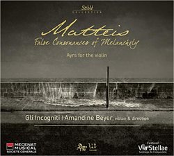 Issu de Naples, ville encore espagnole sur la carte et dans les mœurs, on lui doit une méthode pour jouer le violon, et des airs aux consonances hétéroclites, à la fois passionnément espagnoles, d'un raffinement italien et de construction allemande. Comme le feront plus tard les compositeurs de l'école napolitaine tels Leo, Vinci ou Pergolesi, Matteis inclue déjà dans ses Ayres des sonorités populaires et des échos “folk” dans l'interprétation. En réunissant dans un seul disque une diversité d'airs pour le violon, la guitare seuls et avec un accompagnement, le pari était risqué. Dans ce genre de récital, bon goût et équilibre sont de rigueur pour montrer l'amplitude du génie de Matteis et présenter une lecture didactique de son œuvre. Dans son propos introductif, Amandine Beyer nous explique sa démarche avec humilité : "Afin de rendre sensible tous les changements d'affects et les bizarreries, nous avons donc tenté de suivre le “conseil pour bien jouer” qu'il [NdlR : Matteis naturellement] donne dans The False Consonances of Musick : “Vous ne devez pas jouer toujours pareil, mais des fois fort et des fois doux, selon votre fantaisie, et si vous rencontrez quelques notes Mélancholiques, vous devez les jouer doucement et délicatement”. Et veuillez croire que tous les efforts ont été mis en œuvre pour trouver ces notes mélancoliques et vous les faire partager...” "Et pourtant elle tourne !" Car dès les premiers accords de la Sonate qui ouvre le disque, nous voici à parcourir un monde d'émotions avec des nuances, où des couleurs différentes ornent chaque pièce. Parmi ce bouquet en fleurs, nous distingons Le Diverse bizzarie Sopra la Vecchia Sarabanda ò pur Ciaccona dont le rythme à la gradation inégalable des chaconnes et des tarentelles napolitaines s'avère hypnotique. Les Airs à caractère tels Aria Malincolica, la splendide Aria Amorosa, la sautillante Aria Burlesca se détachent avec panache et dévoilent la maîtrise des timbres instrumentaux de Matteis et la sensibilité d'Amandine Beyer et de Gli Incogniti. L'ironie, la mélancolie, le sentiment amoureux, les “musical humors” que les britanniques connaissent bien depuis cet autre “O.V.N.I.” qu'était Tobias Hume, sont transmis avec délicatesse et sensibilité au fur et à mesure de la succession de pièces. Cette redécouverte ne serait rien sans la profondeur gourmande du jeu d'Amandine Beyer, que ce soit en soliste ou en chef, qui rend remarquablement le prisme des “goûts réunis” de ce napolitain rompu aux canons allemands adoptés par les Anglais. Les Incogniti sont splendides de justesse et de cohérence : Baldomero Barciela à la viole de gambe et Anna Fontana au clavecin mènent brillamment la troupe dans le continuo. Matteis passant pour un guitariste redoutable, ses pièces sont des morceaux de choix pour les cordes pincées, défi que Francesco Romano et Ronaldo Lopes relèvent avec brio. Et l'on a l'impression que Nicola Matteis est peu à peu, note à note, accord après accord, dévoilé par ce récital d'une tenue qui le dispute à l'enthousiasme. Car Amandine Beyer et Gli Incogniti ont saisi que le véritable Matteis ne repose pas dans le silence des bibliothèques, mais dans l'inspiration inventive et brillante de sa musique. Et nous l'avons désormais également compris. Enfin, les mélomanes gagnés par le compositeur se tourneront également vers l'excellent enregistrement d'Hélène Schmitt paru chez Alpha l'année dernière.