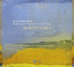 Genre : musique ancienne Mediterranea Alla Francesca : Brigitte Lesne (chant, harpe médiévale, harpe gothique, percussions), Pierre Hamon (flûtes à bec, traversière bansuri, double flûte, flûte et tambour, cornemuse), Carlo Rizzo (tammorra, tamburello, tambourins, chant)