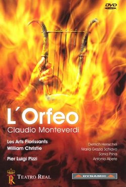 Le profane qui se heurte pour la première fois à l'Orfeo de Monteverdi dans son intégralité a le sentiment de participer à une cérémonie. Des l'apparition de la Musica, les allusions aux mystères de la création apparaissent. L'Orfeo n'est pas simplement une fable, un spectacle divertissant et léger, mais une œuvre qui "colle" au spectateur, à la perception très intime. Le spectacle donné en mai 2008 par Pier Luigi Pizzi au Teatro Real de Madrid, semble tenir compte de cette vision. Nous connaissons les productions souvent fastueuses du metteur en scène italien. Cependant, si nos yeux voient, amusés, les musiciens et notamment William Christie affublés de fraises et de cols XVIIème, la mise en scène va beaucoup plus loin que la boutade. La fable d'Orfeo commence dans la cour schématisée d'un palazzo italien - pourquoi pas Mantoue - dans une Renaissance heureuse. Puis les Enfers seront représentés dans un dépouillement spectral, inquiétant et mystique. La barque de Charon contient des âmes transies par le dernier soupir, et flotte dans une mer noire de damnés. Enfin, le dernier acte revient dans le décor Renaissance, évidé de sa joie et dans une lumière hivernale Orphée rejoint son père Apollon dans l'empyrée. Cette excellente mise en scène mélange des costumes inspirés du Titien, de Véronèse ou Ghirlandaio avec d'élégantes tenues contemporaines. Dans une lecture esthétique très raffinée, Pier Luigi Pizzi humanise dans le malheur Orphée, le rend proche par le costume, et l'éloigne de son cadre mythique : Orfeo c'est nous. Il est tout de même dommage que les danses aient été aussi négligées. Contrairement à l'admirable mise en scène de Gilbert Deflo au Teatro del Liceu de Barcelone (DVD Opus Arte, captation 2002) où les danses faisaient partie intégrante de l'œuvre, nous assistons ici à un manque de drame et de coordination de la part de Gheorghe Iancu qui privilégie une spontanéité brouillonne. Côté voix, alors que la mise en scène et les costumes nous ont bouleversé, on ne peut malheureusement en dire la même chose de l'Orfeo décevant de Dietrich Henschel. S'il est vrai qu'il campe physiquement un Orfeo chevaleresque, à l'allure plus proche de Don Quichotte que du tendre fils d'Apollon, la voix s'avère tendue et nasale. En outre, l'attention à la prosodie est insuffisante, ce qui est fatal au recitar cantando de Monteverdi. Le “Vi ricorda boschi ombrosi” en devient plus bouffon que joyeux. Par ailleurs, Henschel rend le personnage grimaçant, l'émotion devient gesticulation excessive, la douleur dans les Lamenti au contraire froide et hiératique, avec une supplication à Charon dénuée de toute passion (le fameux "Possente Spirito") quand Furio Zanasi nous émouvait jusqu'au larmes chez Savall. Il est fort dommage que le personnage principal devienne si terne, malgré les pages remarquables de Monteverdi. A l'inverse, Maria Grazia Schiavo est idéale dans les trois rôles de Musica, Euridice et Proserpina, maniant avec élégance la gestuelle et rendant parfaitement intelligible la poésie par une prononciation et un talent déclamatoire sans conteste. Elle incarne avec cérémonie, théâtre et finesse la Musica, et explire avec grâce la gamme des émotions : son Euridice est à la fois tendre et funeste dans la scène infernale, sa Proserpine royale et touchante. Saluons également les prestations des rôles courts mais essentiels. Le Charon de Luigi De Donato est spectaculaire de drame et de tonalité, ses graves veloutés et comminatoires. Il campe son personnage avec la grandeur mythologique et la puissance terrifiante du passeur fantomatique. Saluons de même l'intervention de Sonia Prina qui développe ses aptitudes techniques et notamment ses aigus dans la dramatique Messaggiera et la hiératique Speranza. Antonio Abete nous offre aussi une restitution sans faute d'un Pluton profond et compréhensif. On remarquera au passage parmi les choristes le trio Juan Sancho, Cyril Auvity et Jonathan Sells, aux très belles voix, qui fait montre d'un jeu présent et actif et de magnifiques couleurs dans les scènes pastorales et infernales. Pour Juan Sancho et Jonathan Sells qui sont issus du Jardin des Voix, voilà un pari totalement réussi et nous attendons avec impatience leurs futures prestations. Par ailleurs, le chœur des Arts Florissants, malgré quelques petits accrocs prosodiques, nous restitue merveilleusement la grandeur de la musique montéverdienne, fascinant par son intensité dramatique et sa superbe maîtrise technique doublée de variations imaginatives. Coté fosse, L'orchestre des Arts Flo, assistés brillamment par Les Sacqueboutiers [de Toulouse] est fidèle à sa merveilleuse réputation, nous entraînant dans les passages pastoraux par ses tempi et son inventivité. Dans les scènes infernales nous sommes transportés dans les plus noirs cauchemars de l'inexistence et de la fantasmagorie, qui atteint son point culminant dans l'épuration presque antique des soli de violon et du duo de harpe et théorbe dans la supplique d'Orfeo face à Charon. William Christie - malgré la fraise madrilène dont on l'a affublé - dirige avec cohérence au clavecin, sans se rendre omniprésent, donnant une force et des couleurs inégalées au récit qu'il déroule avec avidité. En dépit de l'interprétation décevante de Dietrich Henschel, la cohérence des interprètes et le respect absolu du drame auquel sont ajoutées des couleurs et des variations - ingrédients pour que le langage symbolique de l'Orfeo déploie ses beautés et ses mystères sauront retenir l'attention des amateurs de Monteverdi, rangeant cette captation à la caméra parfois scolaire juste en-dessous de celles de Savall (Opus Arte) ou René Jacobs (Harmonia Mundi). Grâce à Pier Luigi Pizzi, William Christie et son équipe, Orfeo a finalement vaincu l'enfer, il s'élève dans les hauteurs de l'immortalité musicale, son initiation est