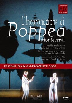 Superbe duo final "Pur ti miro" © Bel Air Classiques La mise en scène de Klaus Michael Grüber est inégale. Si les costumes oscillent malheureusement entre le carnaval de collège (les soldats romains, Amour), la tenue de plongée (Otton, Poppée) ou la boîte de nuit (Néron), le décor en clair obscur, avec ses arbres rappelant la Toscane, confère à l'ensemble un mystère ouaté. Les effets de lumières sont particulièrement réussis, et la scène du Page et de la Demoiselle se déroule dans le dépouillement suggestif d'un verger. Enfin, le mur rouge inspiré de Pompéi rappelle moins l'opulente cité de Pompéi qu'une caserne de pompiers. Le jeu des chanteurs est assez statique, sans les excès courus à notre époque, et la sensualité que dégage le couple principal sans jamais s'embrasser ou se toucher pendant plus de deux heures est d'autant plus remarquable. Si l'on accepte la perte de la Scène du Couronnement, il s'agit, à côté de la version de René Jacobs et sa mise en scène Madonna (DVD Harmonia Mundi) d'une des meilleures versions disponibles en DVD. Au disque, on recommandera la première version d'Harnoncourt (Teldec), ou celle de Malgoire (CBS).