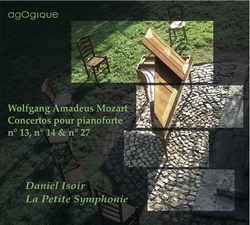 © AgOgique, 2012 Aux articulations souriantes et tragiques de nos artistes précités, aux frémissements mouvants et parfois préromantiques, à l’horizon sur la mer, Daniel Isoir substitue un art de miniaturiste. L’Allegro vivace du Concerto n°14 avec son bouillonnement saccadé rappelle soudain les tâtonnements de l’école de Mannheim et le style plus galant d’un Holzbauer ou d’un Stamitz, ôtant à Mozart son habituelle puissance évocatrice, compensée par la clarté lumineuse de chaque ligne et l’enthousiasme général, que caractérise des temps forts très marqués et d’une spontanéité libre. Le pianoforte de Daniel Isoir – d’après un modèle de 1780 de Stein – se révèle d’une ductilité sans faille, simple primus inter pares élégant lorgnant vers le Concerto Grosso. La tendresse bourgeonnante du célèbre Andantino, bercé par les superbes sonorités des violons, n’est que douceur sensuelle et fragilité charmante, évitant l’écueil de la mièvrerie, pour un discours aux articulations épurées, très détachées, même si l’on regrette que le pianoforte ne se livre pas à une lecture plus passionnée et contrastée. De même, le Larguetto du Concerto n°27, intimiste et soyeux, fait la part belle au dialogue entre le piano soliste et l'orchestre réduit, avec des équilibres souples et lumineux, aussi changeants que subtils que ne sont pas sans rappeler certains Brandebourgeois... Et pourtant, on finit par déplorer la finesse du tissu orchestral qui dans les tutti n'évite pas l'écueil d'une transparente sécheresse, de la clarté trop forte du scialytique de la salle d''autopsie. L'ample Allegro du Concerto n°13 souffre ainsi - en dépit de la virtuosité éloquente d'Isoir et de certains phrasés d'un naturel qui confine à l'évidence - des interventions d'un ensemble émacié, attentif et fidèle, mais par trop chambriste. Et, quoique les effectifs restreints permettent au pianoforte d'être pleinement audible même lors des tutti, les tournures carrées des violons, le détail de chaque pupitre, conduisent justement à ce que la partie se substitue au tout, à ce que que l'attention soit sans cesse reportée sur de multiples contrepoints, s'égare à admirer la tournure sautillante et primesautière d'un cor ou d'une flûte (Allegro du n°27), au détriment de la ligne générale. En conclusion, La Petite Symphonie livre une lecture rafraichissante et novatrice d'un Mozart à l'intimité retrouvée, aux timbres éclatants et colorés, tirée par l'interprétation de haut vol d'André Isoir, d'une fluidité solaire, mais dont le parti-pris d'une voix par partie amoindrit la force. Alors, non, nous ne pourrons renier la grandeur souple de Brendel, mais cette une vision personnelle, différente, gagne sans nul doute à être entendue et appréciée.