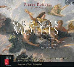 Grand oublié de l’histoire, Pierre Robert fut pourtant avec Henry du Mont celui qui porta durant la période la plus prospère du Règne de Louis XIV, le genre du grand motet à son accomplissement. Tout deux devinrent par semestre Sous-maîtres de la Chapelle Royale en 1663 et quittèrent leurs fonctions en raison de leurs réticences aux demandes d’évolution du Roi, en 1682 lors de l’installation officielle de la cour à Versailles. Le Roi toutefois sut rendre à Pierre Robert un véritable hommage, qui nous permet encore d’entendre aujourd’hui certaines de ses œuvres. Il fit imprimer par Robert Ballard en 1684 le Recueil pour la Chapelle du Roi qui comporte 24 motets à deux chœurs et instruments du compositeur ayant permis ainsi à environ un tiers, seulement, de la production de Pierre Robert de nous parvenir. Peut-être peut-on imaginer que sa musique religieuse, évoquait en lui, tout comme pour Lully dans le genre profane cette jeunesse d’un Roi Soleil, cherchant à éprouver son pouvoir mais également en quête de plaisir et qui fit de la musique une marque d’opulence, signature de sa gloire éternelle. Ouvrant l’enregistrement, le De profundis, qui date de 1678, est une œuvre bouleversante. Alors que rien ne semble indiquer qu’un deuil ait frappé la cour de France cette année là, cette œuvre moderne pour son temps, nous frappe par sa flamboyante luminosité. Entre le petit chœur dont surgit les voix solistes et le grand chœur composé par les Pages et les Chantres du Centre de Musique baroque de Versailles, ce De profundis révèle une vision de la mort tout à la fois tragique et dansante, terrifiante et bienheureuse, appelant à une libération qui éblouit. Les chanteurs construisent par leur interprétation une architecture du sublime. Olivier Schneebeli se fait maître des reliefs et des nuances. Il permet à la musique de devenir aussi mouvante que les ailes des anges de la Chapelle Royale et de se torsader comme leurs tissus. Elle devient un souffle irréel. Instrumentistes et solistes apportent des couleurs, véritable arc en ciel sonore. Entre voix adulte et voix d’enfant, entre sopranos et hautes contres en particulier, tout ici irradie. La mort ne peut donc être que radieuse. Suivant ce motet vient ensuite le Quare fremuerunt, probablement le plus ancien de cet enregistrement datant de la période 1664/66. Il affirme par ses accents guerriers les orientations d’un jeune roi qui veut ainsi démontrer sa puissance tant temporelle que spirituelle. Virtuose pour la voix, les mots y deviennent conquérants et les interprètes en soulignent la force vitale qui les anime. Ici la véhémence s’affirme dans des aigus quasis inhumains, des graves à la profondeur abyssale. Les interprètes se jouent des difficultés, leurs timbres s’entrechoquent venant briser les résistances tel un vase d’argile (Reges eos in virga ferrea…). Le Te decet hymnus rappelle certaines œuvres de Lully. Les musiciens de Musica Florea apportent aux chanteurs l’incarnat d’une basse continue source de gloire. L’orchestre bénéficie ici d’une composition très particulière. Il fait appel au quintette français (haute-contre, taille, quinte et basse), offrant à la composition vocale une amplitude permettant de souligner la renommée du souverain. Les réponses des solistes et du chœur accentuent les reliefs des différents plans sonores, ouvrant l’espace clos de la chapelle vers l’infini. Une pulsation inébranlable émane de ces effets polychoraux, créant une inébranlable dynamique. Concluant ce CD le Nisi Dominus, appel à la miséricorde divine, vient parachever cette affirmation d’un pouvoir qui vous sauve de toutes les craintes. Une fois encore, emportées par le mouvement de ces masses sonores voluptueuses, les voix s’élèvent, se soutiennent et se libèrent de toutes contraintes. Tout ici est admirable, aucun interprète ne pouvait mieux que ceux qui y figurent nous révéler le sublime d’une musique qui avait été injustement oubliée. Mots et musique y fusionnent en une extase salvatrice.