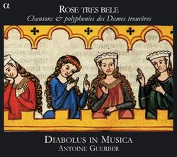 | Genre : musique ancienne "Rose tres bele" Chansons et polyphonies des Dames trouvères (XIIIe siècle) Aino Lund-Lavoipierre, Estelle Nadau (soprani), Estelle Boisnard (soprano, fûte traversière), Bruno Caillat (percussions) Evelyne Moser (vièle à archet), Antoine Guerber (harpe). Diabolus in Musica, dir. Antoine Guerber. 1h 10, Alpha, 2010.