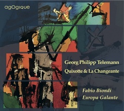 Ce dernier trouvera plus franchement manière à s'exprimer dans la fantaisiste Suite "Burlesque de Quixotte", excentrique succession de brefs tableaux non dénuée d'humour, et à la variété de ton et de climats tourbillonnante. Europa Galante s'engouffre dans ce combat contre les moulins à vent avec gourmandise et nervosité, et l'on en vient à regretter l'admirable brièveté de l'œuvre et l'économie de moyens de Telemann tant cette Suite bouillonnante aurait pu être prolongée. Après une ouverture vive et déjà fantasque, l'orchestre se fait peintre, et, conformément aux titres d'origine, dépeint avec vigueur les différents épisodes, reniant parfois volontairement sa recherche d'hédonisme musical pour coller au plus près de l'histoire, comme avec les Soupirs amoureux auprès de la Princesse Dulcinée au legato qui frise le sentimentalisme dégoulinant, relevé ironiquement par un clavecin sautillant. De même, Le Galop de Rossinante, grinçant à cravaché à souhait, n'est pas sans rappeler les charges de cavalerie de la Battalia de Biber. Le Concerto en sol majeur, au Largo initial noble et ample, apporte un contraste curial bienvenu après l'originale cavalcade de Quixotte. Il faut noter qu'il s'agit-là d'une des premières œuvres destinées au registre d'alto. Le langage, moins ébouriffant et vénitien que dans le Concerto précédent en fa majeur, se révèle dans ce mouvement plus corellien dans son essence, avec sa palette harmonieuse et solaire, quoique l'Allegro soit réminiscent de certains concertos pour violoncelle du Prete Rosso. Au diable les comparaisons, quoiqu'il en soit, le jeu et surtout le timbre chaleureux et coloré de Stefano Marcocchi sont à louer sans réserve, et l'on profitera de l'occasion pour célébrer la pertinence des tempi choisis par le chef, qui tout en étant particulièrement contrastés, savent préserver la lisibilité de la ligne mélodique, et jouer sur des effets de tension et de relâchement constants, ce qui confère une vision moirée et opulente à l'ensemble. Ces qualités subtiles sont d'autant plus à apprécier que l'on réduit trop souvent aujourd'hui l'approche italianisante à des tempi excessifs et à des nuances taillées à la serpe quoiqu'excitantes. On passera plus rapidement sur le Concerto en do majeur pour deux violons, qui nous a personnellement paru le plus faible du programme, le plus prévisible bien que doté d'un Adagio d'un sentimentalisme troublant dans l'entremêlement presque passionnel des deux voix. Biondi et Rognoni, visiblement sous le charme, font durer le mouvement intermédiaire dans une caresse sensuelle et colorée. Reste la Changeante, ouverture en sol mineur au style plus français mais à l'inventivité constante, aux tonalités fluctuantes presque jusqu'au malaise tant l'auditeur est sollicité par ce kaléidoscope d'affects différents. Europa Galante semble vouloir expédier l'Ouverture en lui ôtant sa majesté, privilégiant la section fuguée, marquant très violemment les notes inégales, puis vient derrière l'apparente superficialité de la succession de danses autant de portraits, un peu à la manière d'un Couperin au clavier, des remuants Scaramouches dont on se défait "Vitement", aux Menuets galants, un Hornpipe insignifiant mais plein d'ivresse nous fait déboucher sur 4 minutes de tendresse alanguie "Avec douceur" comme l'indique le compositeur : mouvement de jeune fille à la balançoire à la Watteau, où Europa Galante dresse avec une plénitude sonore inégalée un croquis charnu et soyeux qu'on aimerait emporter dans ses draps.