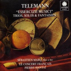 Genre : musique de chambre Georg Philipp TELEMANN (1681-1767) "Essercizii Musici" Trios, Solos et Fantaisies Trio en la Majeur pour flûte à bec, clavecin obligé et basse continue Concerto à trois en fa Majeur pour flûte à bec, cor et basse continue Fantaisie en la Majeur pour flûte de voix seule Trio en fa Majeur pour flûte à bec, viole de gambe et basse continue Sonate en trio en la mineur pour flûte à bec, violon et basse continue Sonate en trio en si bémol Majeur pour flûte à bec, clavecin obligé et basse continue Sonate en do Majeur pour flûte à bec et basse continue Fantaisie en fa Majeur pour flûte à bec seule Sonate en la mineur pour flûte à bec, hautbois et basse continue Sébastien Marq, flûte à bec Le Concert Français : Alfredo Bernardini, hautbois - François Fernandez, violon - Jérôme Hantaï, viole de gambe - Claude Maury, cor - Rainer Zipperling, violoncelle - Elisabeth Joyé et Pierre Hantaï, clavecins - Vincent Charbonnier, contrebasse 70’04, Astrée Auvidis, enr. 1995