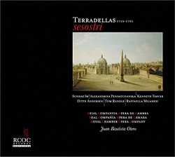 Bien qu’en 2012, le pays du Nil fait davantage parler du chaos et des désordres de la Place Tahrir que des monarques de son passé solaire, la recréation et la gravure au disque d’un opéra consacré à un souverain égyptien autre que Cléopâtre VII suscite notre curiosité, surtout si la musique est composée par le divin Domenec Terradellas. Poursuivant sa série dédiée à la redécouverte du compositeur catalan dont nous avions goûté l'Artaserse (RCOC, 2008), Juan Baustista Otero et sa Real Companya de Opera de Camara enregistrent le dernier opéra séria de Terradellas. Cette partition est symbolique, étant un des plus grands succès du catalan et aussi sa dernière composition puisque c’est en sortant du théâtre le soir de la triomphale première que Domenec Terradellas se fait assassiner par des mystérieux sbires que d’autres ont voulu commandités par le jaloux Niccolo Jommelli. Si les anecdotes de rivalités musiciennes sont croustillantes et les compositeurs baroques ne sont aucunement épargnés par des morts mystérieuses, Terradellas intègre la série noire des génies musicaux morts violemment, à l’époque baroque n’oublions pas que Jean-Marie Leclair est retrouvé poignardé sur le bas de sa porte et que le délicieux Leonardo Vinci a été sans aucun doute empoisonné. Domenec Terradellas faisait avec ses superbes compositions une ombre considérable au romain, dont les éclats de rage et de jalousie étaient proverbiaux. Ce Sesostri s'avère d’une richesse orchestrale et d’une modernité ahurissantes : par rapport à l’Artaserse de 1744, Terradellas sort du moule de l’opera séria avec des couleurs étonnantes et donne une place extrêmement intéressante aux voix de ténor qui en Amasi et Fanete développent un dramatisme absolu et efficace. Par rapport à la partition vénitienne de 1744, Terradellas a mûri son style et s’adapte au style romain tardif qui préfigure étonnamment les génies de Cimarosa, Paisiello et même des Zingarelli ou autres Generali. On ne le dit pas assez, mais l’influence des compositeurs de ce milieu du XVIIIe siècle est essentielle pour la construction du style dramatique et orné qui aboutira à Rossini voire Verdi. Les graines du vérisme sont ainsi perceptibles dans les partitions tant de Jommelli que de Terradellas, la force harmonique, la présence d’intrigues bien ficelées et cohérente, tournent le dos à l’ancien et interminable opéra séria dont les saltimbanques le rapprochaient beaucoup du merveilleux mais l’éloignaient de la réalité. Recréé en décembre 2010 à l’Auditori de Catalogne, Sesostri a retrouvé entre les mains de Juan Bautista Otero et de son équipe une force incroyable, une jeunesse exceptionnelle et une puissance colorée que peu d’ensembles baroques peuvent donner. Les plus belles pages de la partition ressortent efficacement par un sens stylistique et rendent à Terradellas son originalité.