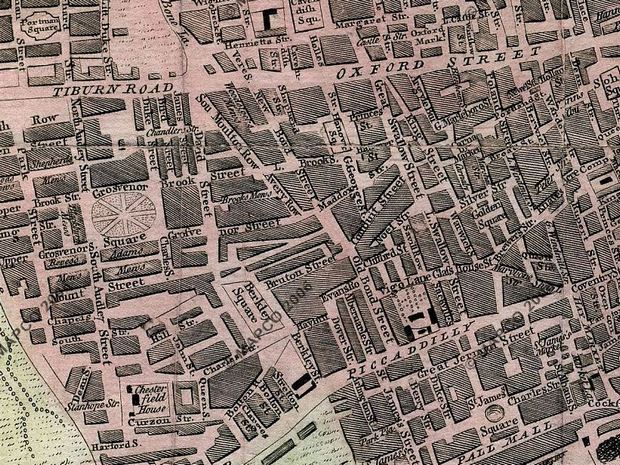 Anonyme - "A Plan Of The Cities Of London And Westminster, And Borough Of Southwark, With The New Buildings (1767)" (détail) © Mapco.net Pour mémoire, Haendel avait emménagé à l'été 1723 à Brook Street, à l'âge de 38 ans, et fut le premier propriétaire de cette maison traditionnelle gérogrienne qui faisait partie d'un lot de 4 construites par George Barne à une épique où le quartier entre Hanover Square et Grosvenor Square était en développement. Cette situation était proche du King's Theatre de Haymarket, comme du Palais de St James. La maison, en briques, était composée de 3 étages et d'un sous-sol contenant la cuisine, selon un plan très usuel avec 3 fenêtres en façade et 2 à l'arrière. Haendel y vécut pendant 36 ans et y mourut. Il légua ses biens immobiliers à son serviteur John Du Bourk. Depuis 2001, le Handel House Museum tente de reconstituer une évocation des intérieurs qu'aurait connu le compositeur. [M.B.]